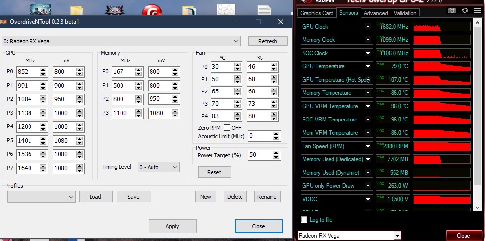 #77 Пришел к отличному способу финального тюнинга. Запускаем Hwinfo, стресс тест 3Dmark (в данном случае FS) в оконном режиме с 100500 циклами, а потом просто в Овердрайве меняем значения и отслеживаем средние показания в HW (последний столбик), когда они стабилизируются, переодически их сбрасывая кнопкой.