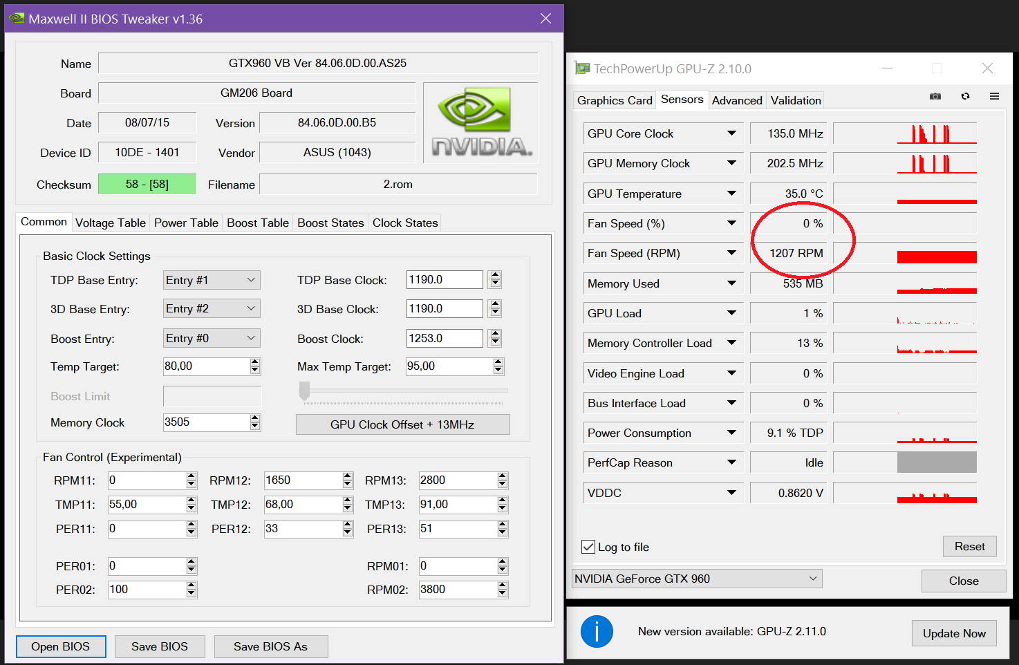 Приветствую. Есть ASUS GT610 (не сайлент) минимальные обороты прошиты на 60% ниже програмно сделать нет возможности. Шумит сильно, греется мало. Слил биос GPU-Z'ом, но с ним ни KeplerBiosTweaker1.27 ни NiBiTor_v606 работать не хотят. Подскажите, чем поправить обороты кулера на биосе ВК.