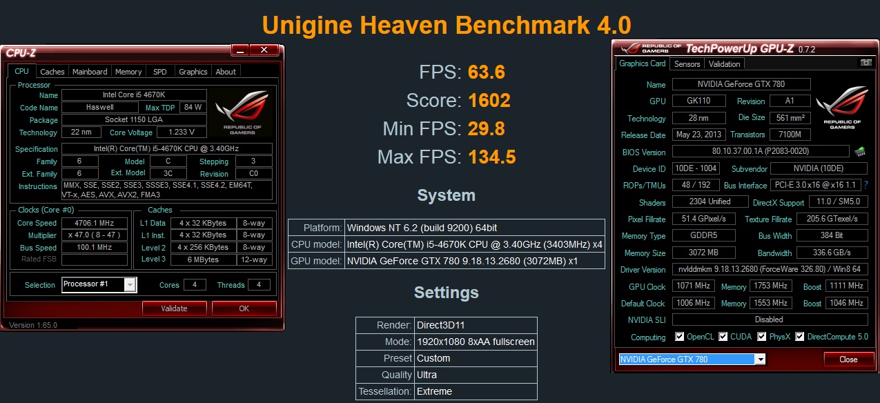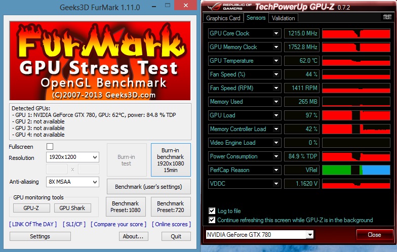 Разогнал GTX 780 Inno Herculez +65 ядро, 7000 память, 106% Power. С учетом дефолтного разгона не плохо, в нагрузке буст скачет 1200-1215. Напряжение не трогал, в нагрузке 1.162v при 1215Mhz. Бублик получается сырым, не прожаривая больше 66С за 40 мин при максимальных настройках. Хотя карта остается абсолютно тихой, думаю скинуть немного оборотов вентилей раз есть запас.