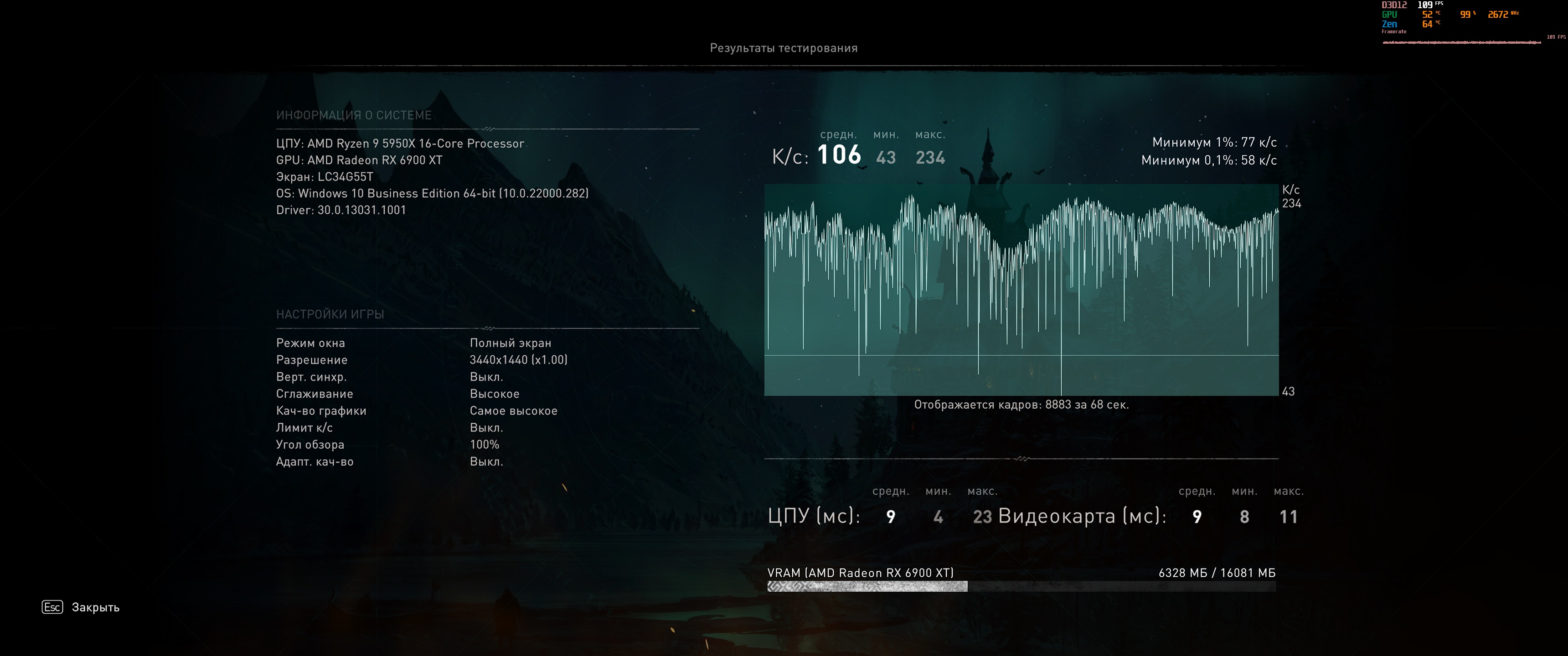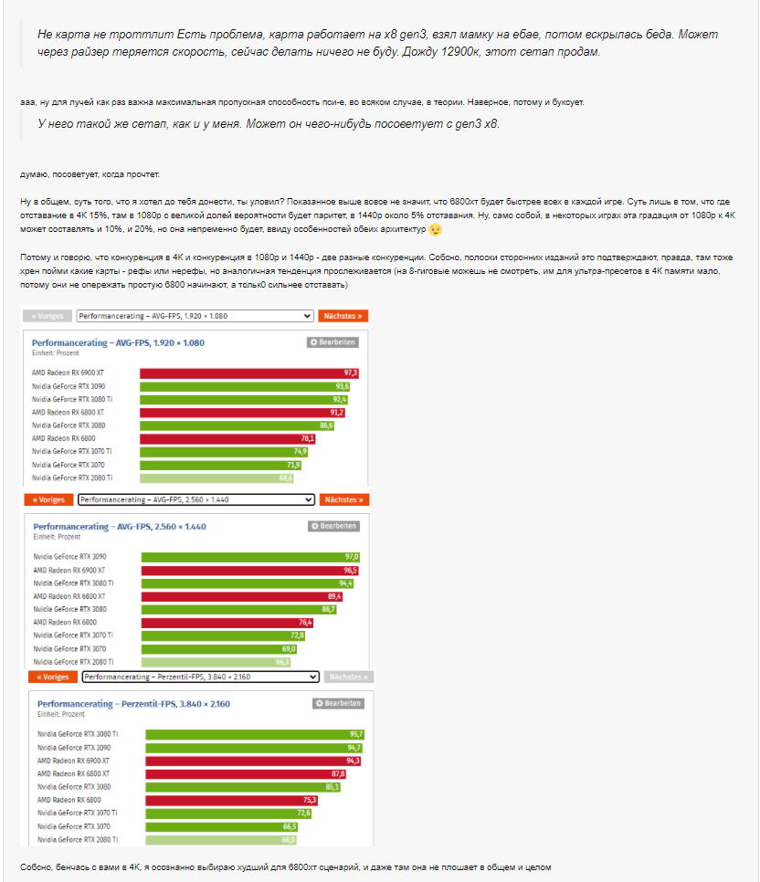 Alexxx480 частоты этой 3090 видел? Я не знаю, какой 6800хт нужен разгон, чтобы обходя стоковую 3080 на 13%, внезапно обойти 3090@2130 на 22%. Тут даже азот бессилен. Да и где же удачная 6800хт, когда другие умудряются 2.7ггц на 1.1в. Обычный середняк у меня. Понятно, что есть и хуже экземпляры, зачастую из-за недочетов в охлаждении.