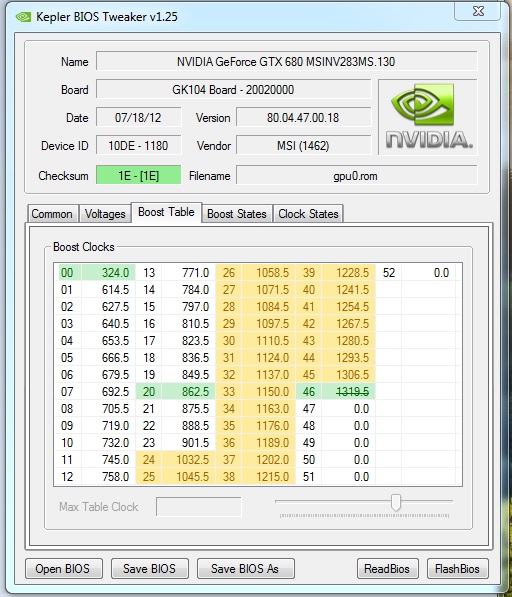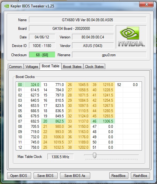 Парни, я что то нахимичил... Юзал программу KeplerBiosTweaker, твикнул биос asus GTX680 dc2 на повышенное напряжение и частоты (1202\6800), попробовал разогнать дальше - ничего путного, дай думаю верну напругу и сровняю с лайтнингом по частотам, чтобы не парится софтом, выставил как на лайтнинге всё (он твиком 1228\6800), прошил ииии, не бустит она больше 1137, Est.Max в нвидиа агент показывакет столько, а буст пишет 1176... ничего не пойму выставил буст 1176 и макс буст 1228, как и на лайте, естесственно поднял стандартное энергопотребление... Как бороться кто подскажет?
