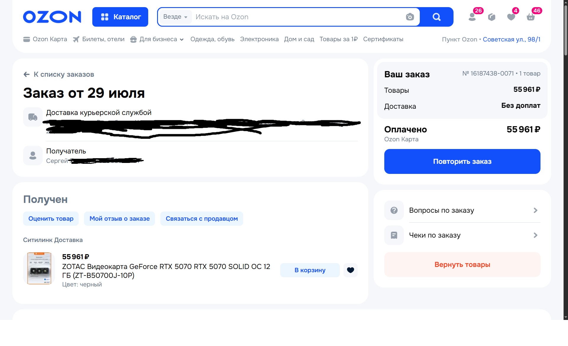 Вот мой скрин покупки с озон, продавец Ситилинк Доставка, даже курьера ждать не стал, приехал в отделение Ситилинка в городе и забрал карту чуть пораньше) Цену в 59к считаю нормальной.