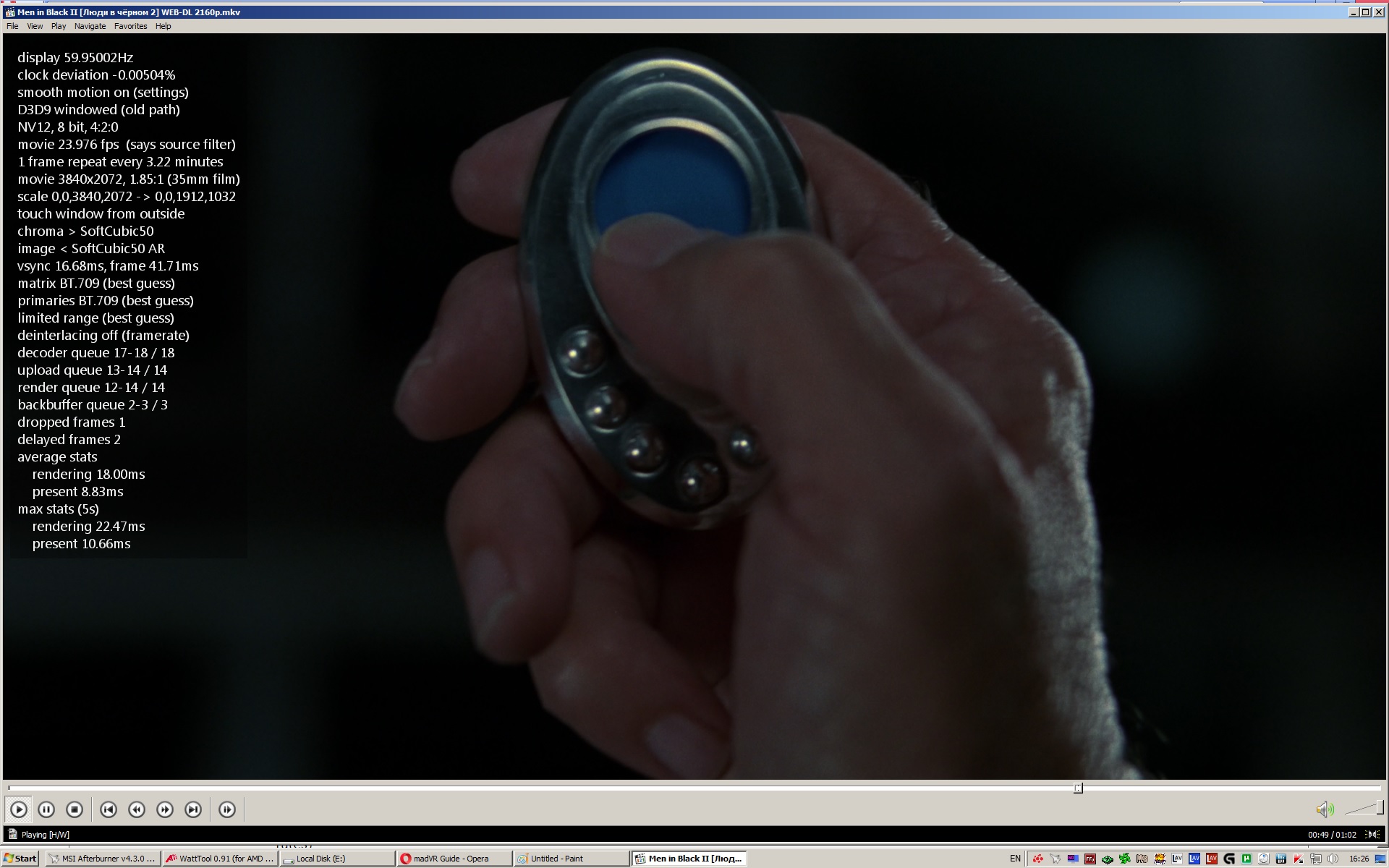 Наблюдение интересное, но 1080 не интересует ни разу - я его и софтварно играю. Можно попросить эксперимент? Включить в madVR скейлеры попроще. Апскейл: Bicubic AR luma/chrome, даунскейл: Catmull-Rom, dithering: ordered или выкл, прочие улучшайзеры не включат. Если моник не 4K и будет даунскейл до 1080p при проигрывании, не проблема. Проиграть вот этот минутный сэмпл, убедиться по статистике (Ctrl-J), что не возникают пропадания кадров. Вообще если есть возможность, скинуть скриншот с открытой статистикой в середине проигрывания.. Чтобы скриншот удалось сделать, не надо madVR переключать в экслюзивный режим вывода.