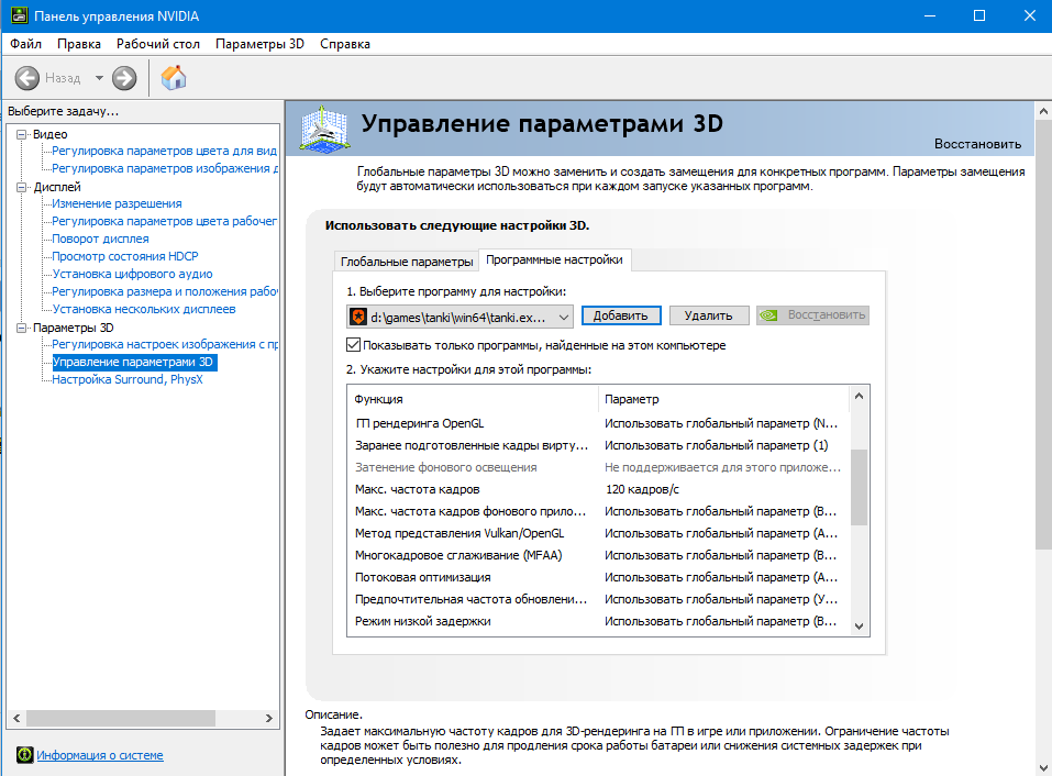 Да там все просто, заходите в Панель управления NVIDIA, затем в управление параметрами 3D, потом вкладка программные настройки, затем нужно добавить ярлык игры "находится он по пути Tanki,win64 ну и выбрать сам ярлык Tanki.exe" и во вкладке макс частота кадров выставить желаемое, у меня например стоит 120