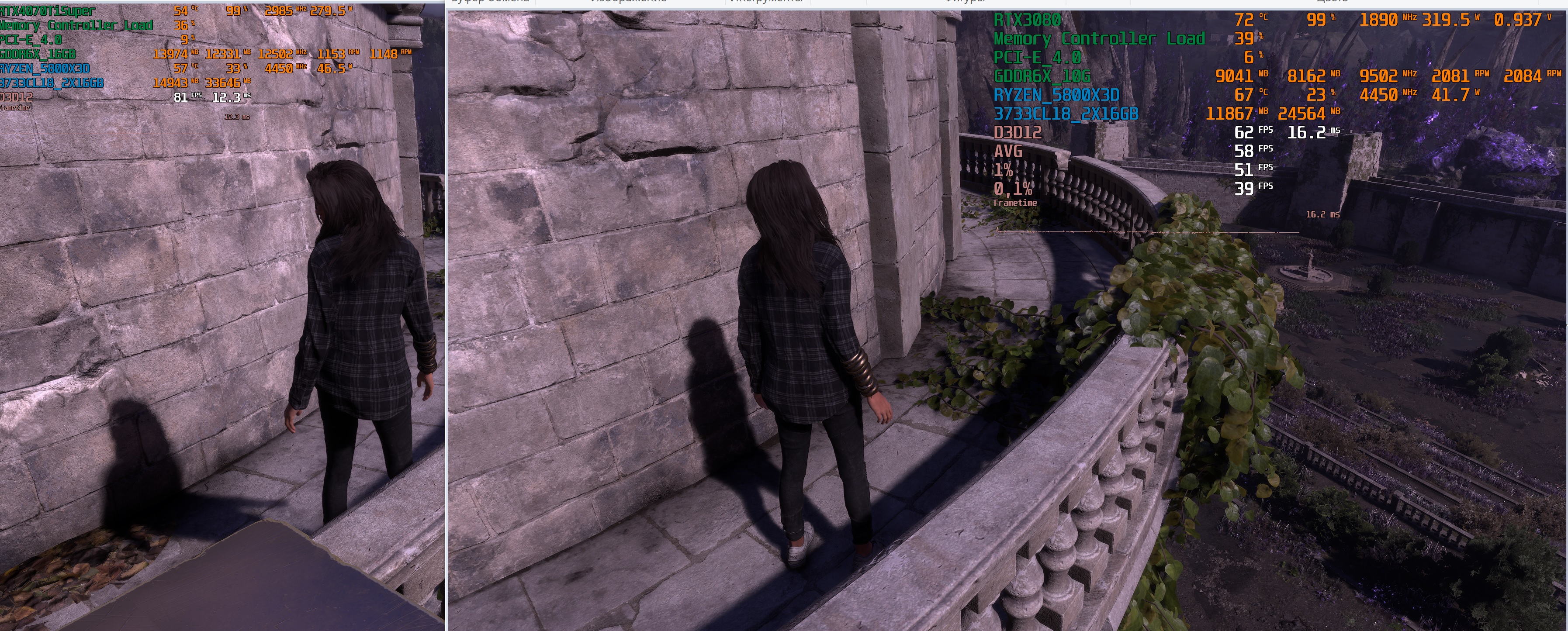 Ну тут в щи разогнанная 4070TiS гпу +225 и память +2000 (сейчас стоит +2400 с новым MSI автабернером). А так в стоке 4070TiS на этом месте было 70 fps... Что вообще печаль, и даже не почувствуешь... Но хотябы карта тихая, холодная и 16гб vram есть - нет проблем в 4K dlss4 производительность в виде мыла, вместо текстур.