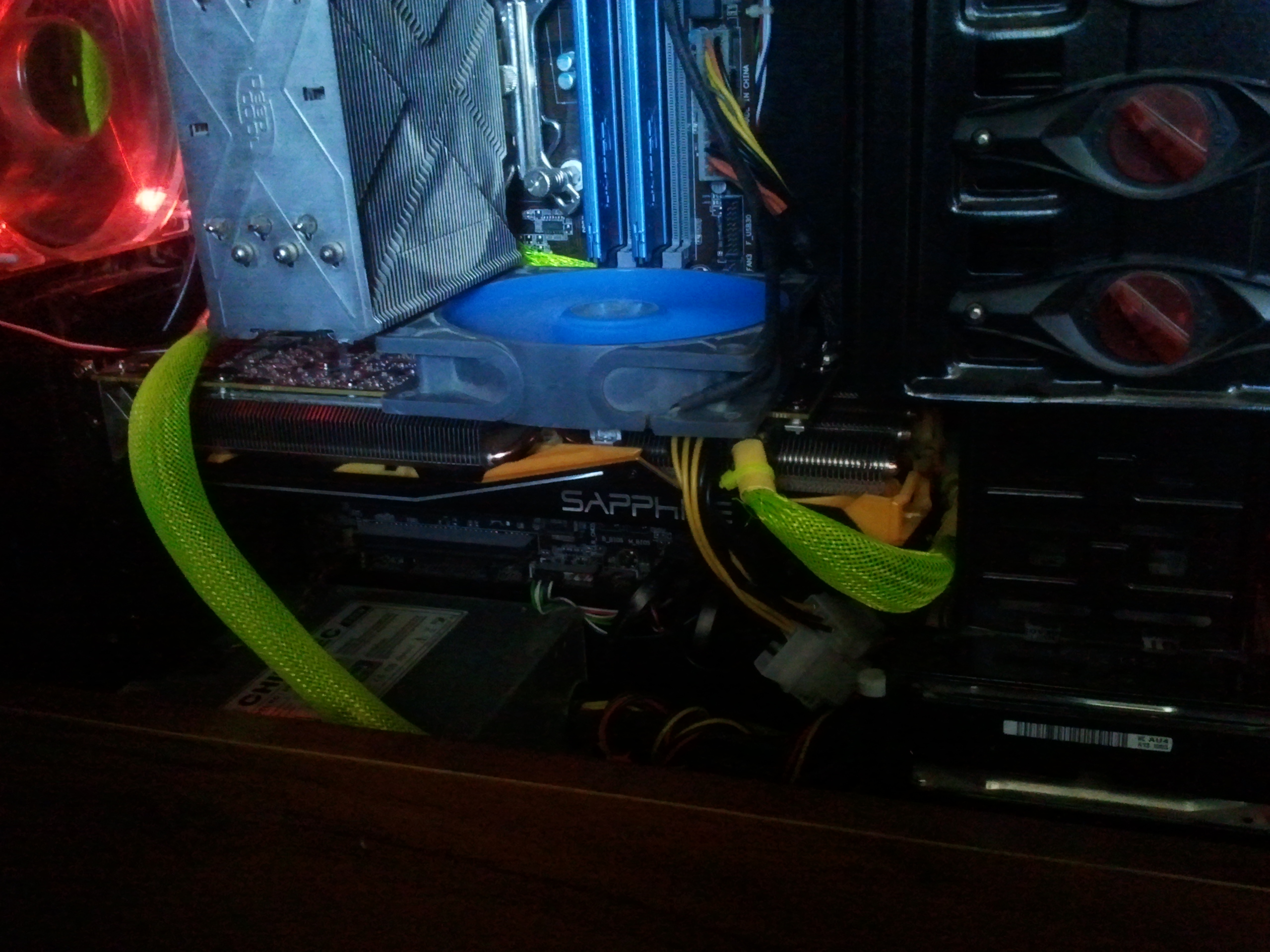 Добавлено спустя 1 час 53 минуты 16 секунд: Снял с процессорного радиатора вертушку и положил на видеокарту в область VRM. В итоге VRM в разгоне с 89-90 градусов упала до 75-76 градусов(и без разгона с 74-75 градусов до 66). Вот как все это выглядит. Теперь думаю, может и оставить так? Остальные компоненты при таком положении вентилятора греться не должны? В том числе компоненты мат. платы. Для процессора куплю еще один такой же вентилятор.