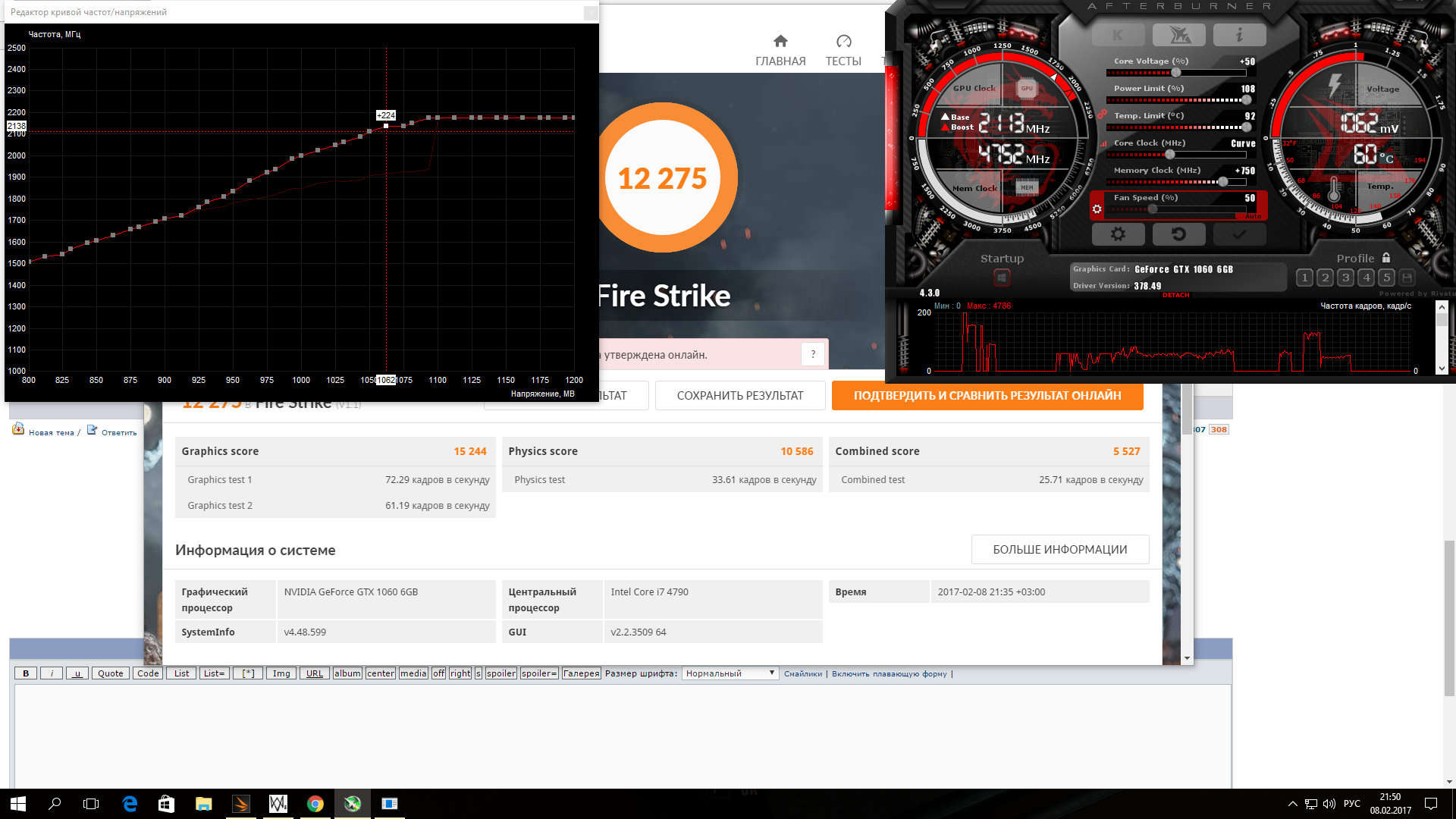 У меня даже близко к этим цифрам не приближается. Даже до 2000 не доходят профили. Посмотрел кривые, попробовал по аналогии себе сделать, получается кукурузный разгон с меньшим фпс в бублике, при большей частоте. Мой в тупую без кривой просто +241мгц дает бОльший прирост. При этом макс напряжение 0.9в всего.