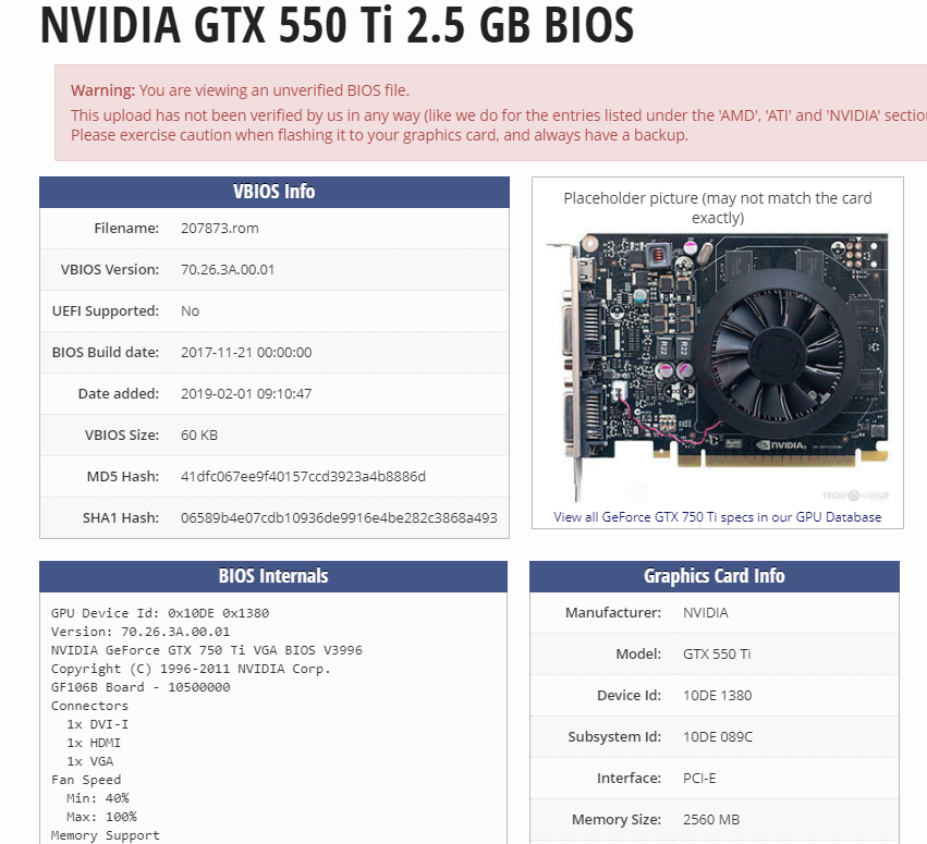 Всех приветствую, наткнулся на вашу тему в поисках прошивки для фейковой 750ti, которая мне досталась. Путём поиска в интернетах по данным GPU-Z по Device ID и прочим удалось определить, что скорее всего это 550ti на 2,5 гига, что косвенно подтверждает то, как она определяется в Piriform Speccy (750ti 2.5 гига, коих насколько мне известно, не существует).