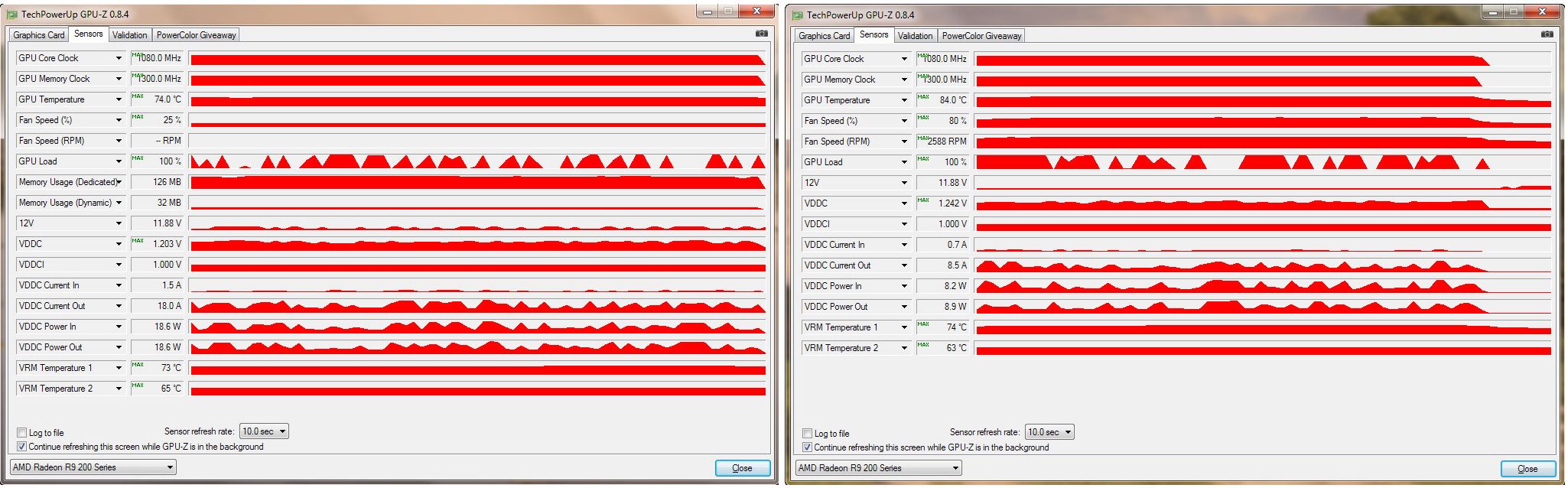 Перевёл верхнюю видеокарту на водянку. Вот результат (в Advanced Warfare), если кому-то интересно (слева - график верхней карты (на воде), справа - нижней (на стоковой СО)):