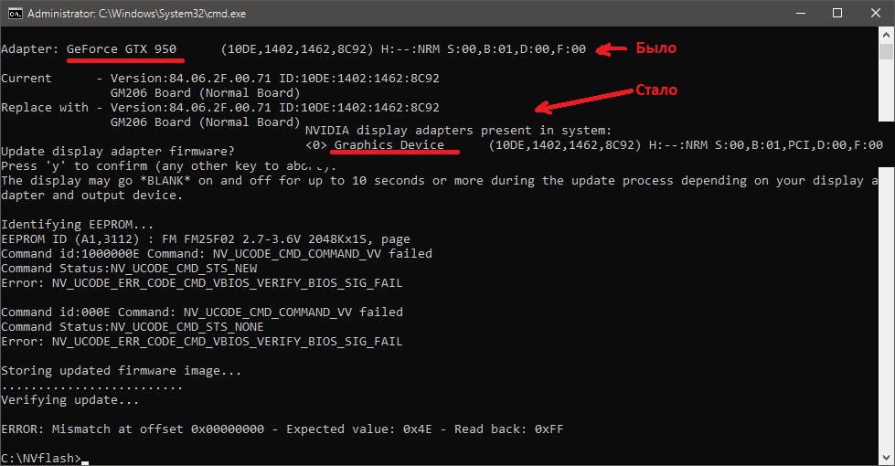 Подскажите как вернуть название карты? После прошивки переделанного биоса, что то пошло не так, карта не запустилась. Вставил вторую видеокарту, перепрошил нерабочую, теперь всё работает и карта определяется везде правильно, но имя в досе изменилось.