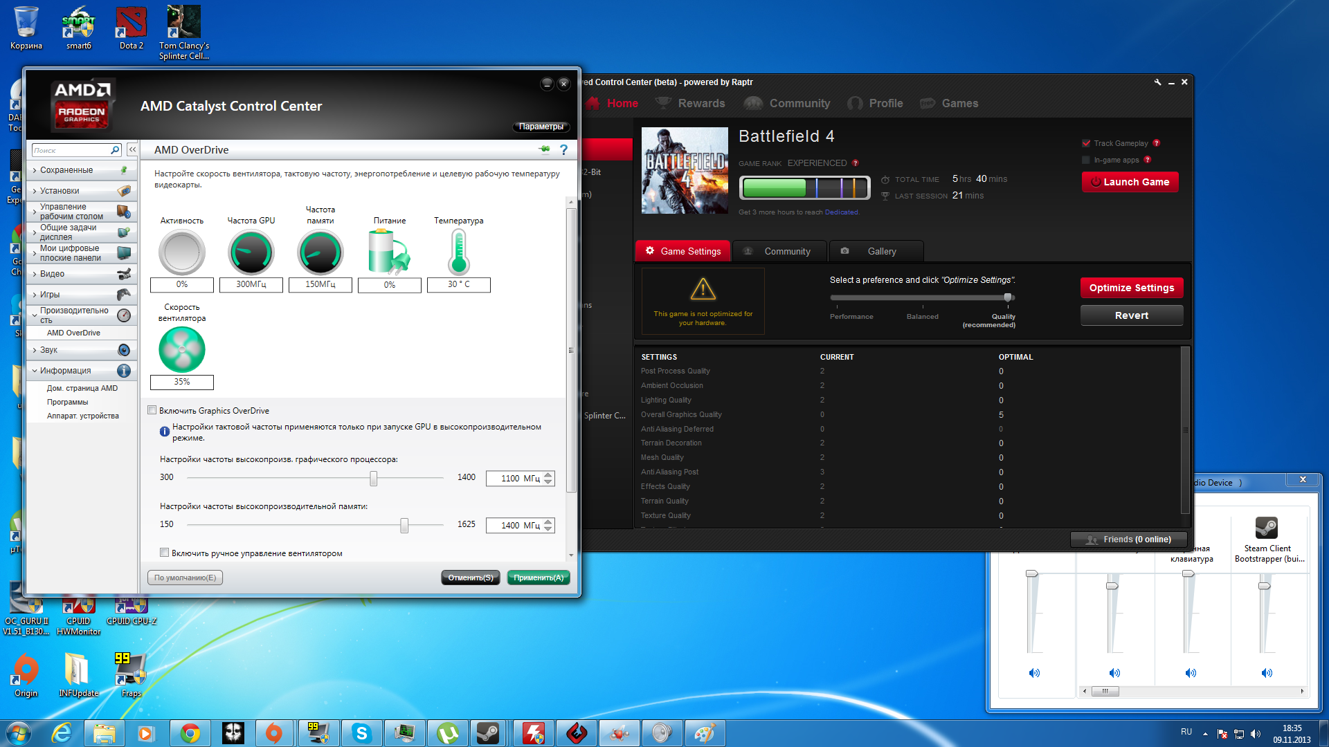На этой карте играл только в бф4 и фпс очень странно скачет на разных картах на 1 он может держать стабильные 40-45 фпс(ультра настройки с 2х сглаживанием фулхд),а на другой где меньше обьектов,отражений и т.д 25-30.Причем взрывы и происходящие на экране вообще не как не влияют,я думал что перегревается и именно поэтому и полез смотреть.