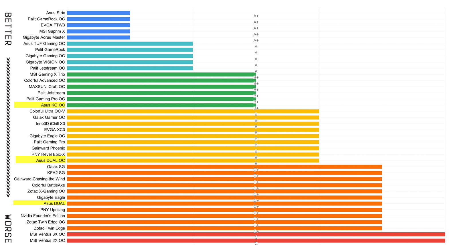 Согласен. Не заметил это Хотяяя... это же последняя таблица, где он делает позиции картам по составленным данным. Логично же, что asus dual OC должна быть выше asus dual, не благодаря системе охлаждения, а разгону с завода. Все правильно получается
