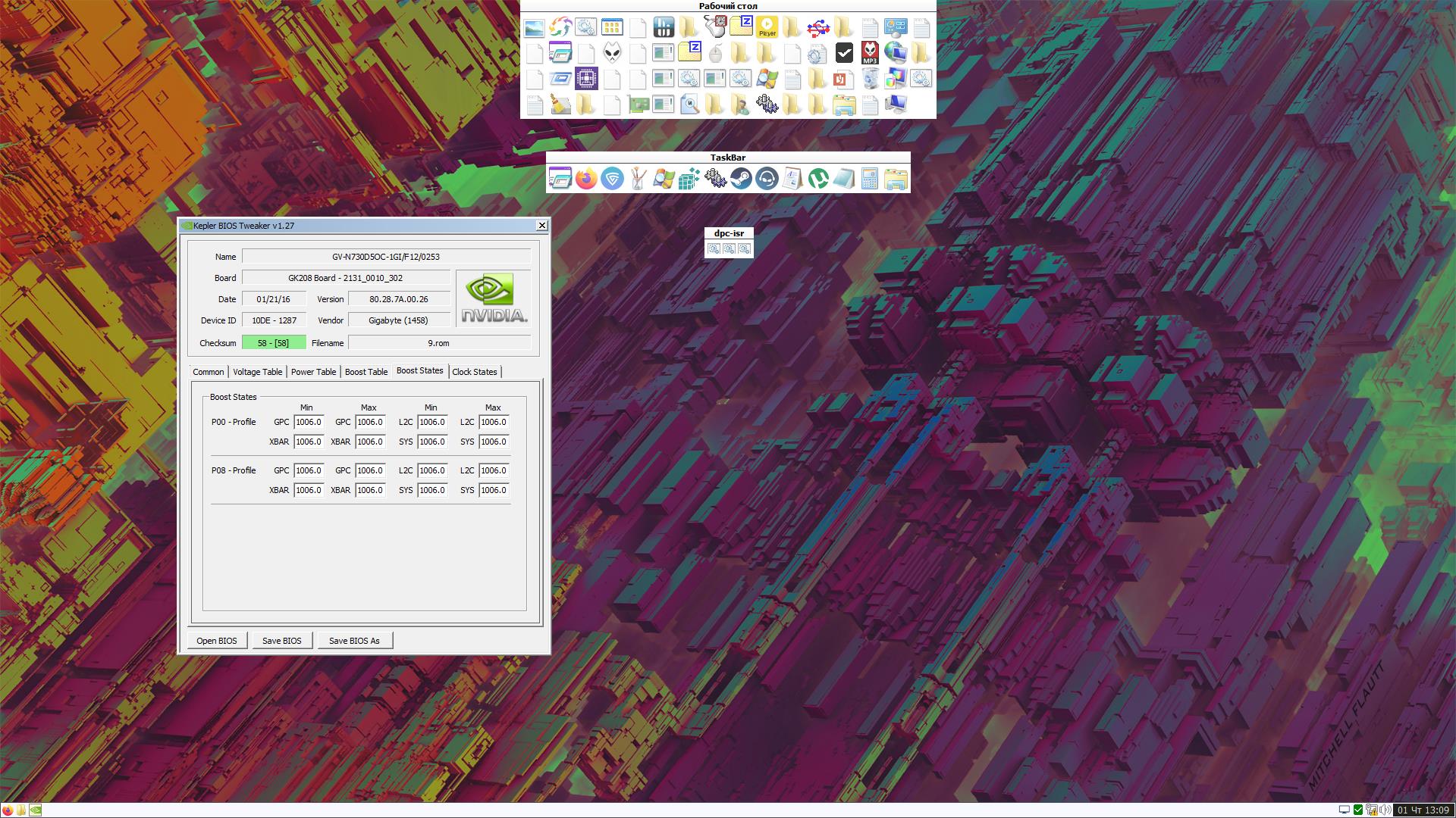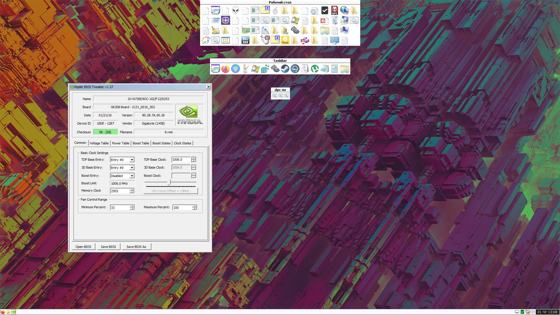 ner Для редактирования биоса нибитор уже не годиться, для кеплеров есть kepler bios editor 1.27, да зашивать отредактированный биос, но прежде чем к этому приступать, тебе нужно найти рабочий вольтаж под желаемую частоту гпу или же наоборот