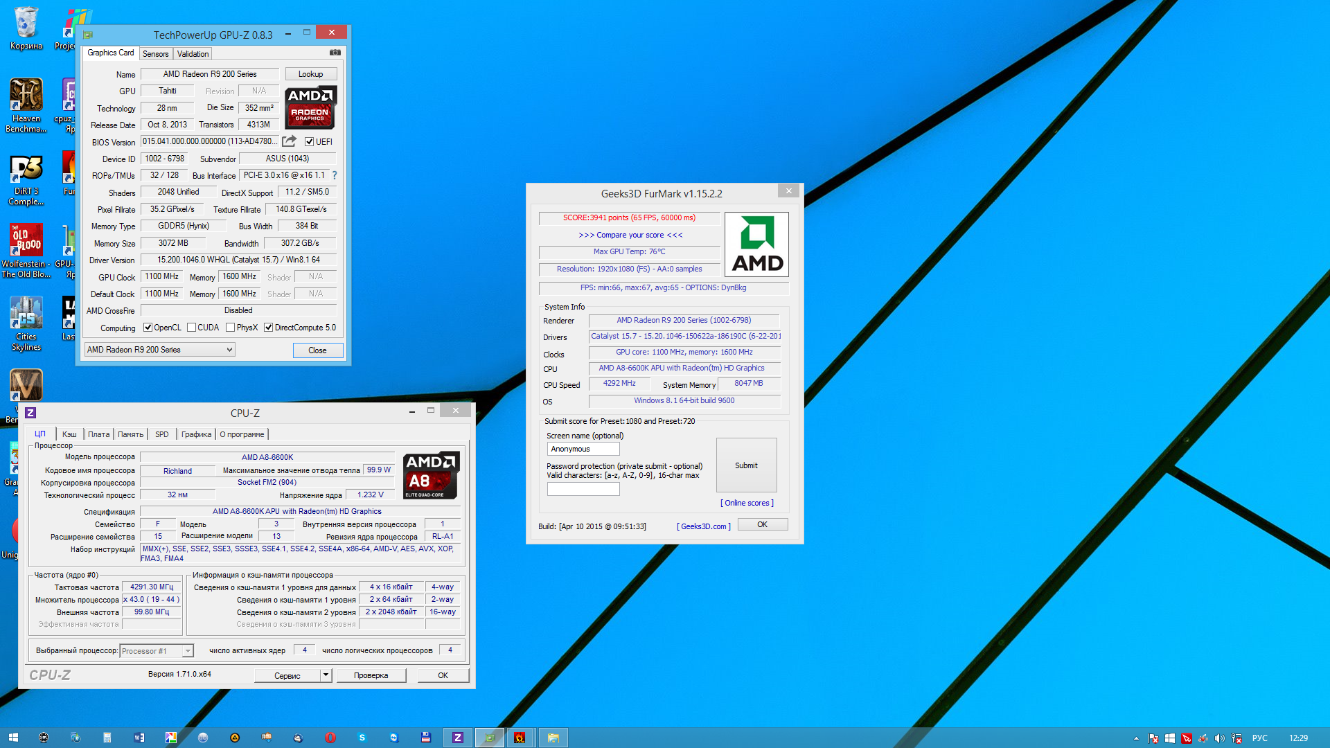 satoman Я так понимаю фурмарк - синтетика, гоняет только карту. Хеавен - реальный тест, производительность как в играх. У вас сколько очков хеавене? Здесь выкладывали скрины выше 900 очков при средних 35 фпс без экстримального разгона. Если сравнивать по фурмарку и хеавену у нас с вами противоположные результаты. У меня в фурмарке быстрее, в хеавене медленнее.