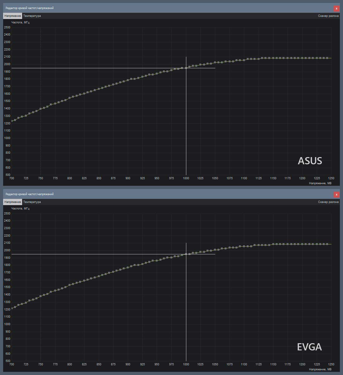 Мнения сложилось два: 1. EVGA очень жестко (хорошо) держит бустовую частоту (1995MHz), в то время как ASUS мечется туда сюда (2025-2010-2025...). 2. Возможно разные показания потребления связанны с использования различных датчиков, надо будет еще проверить.