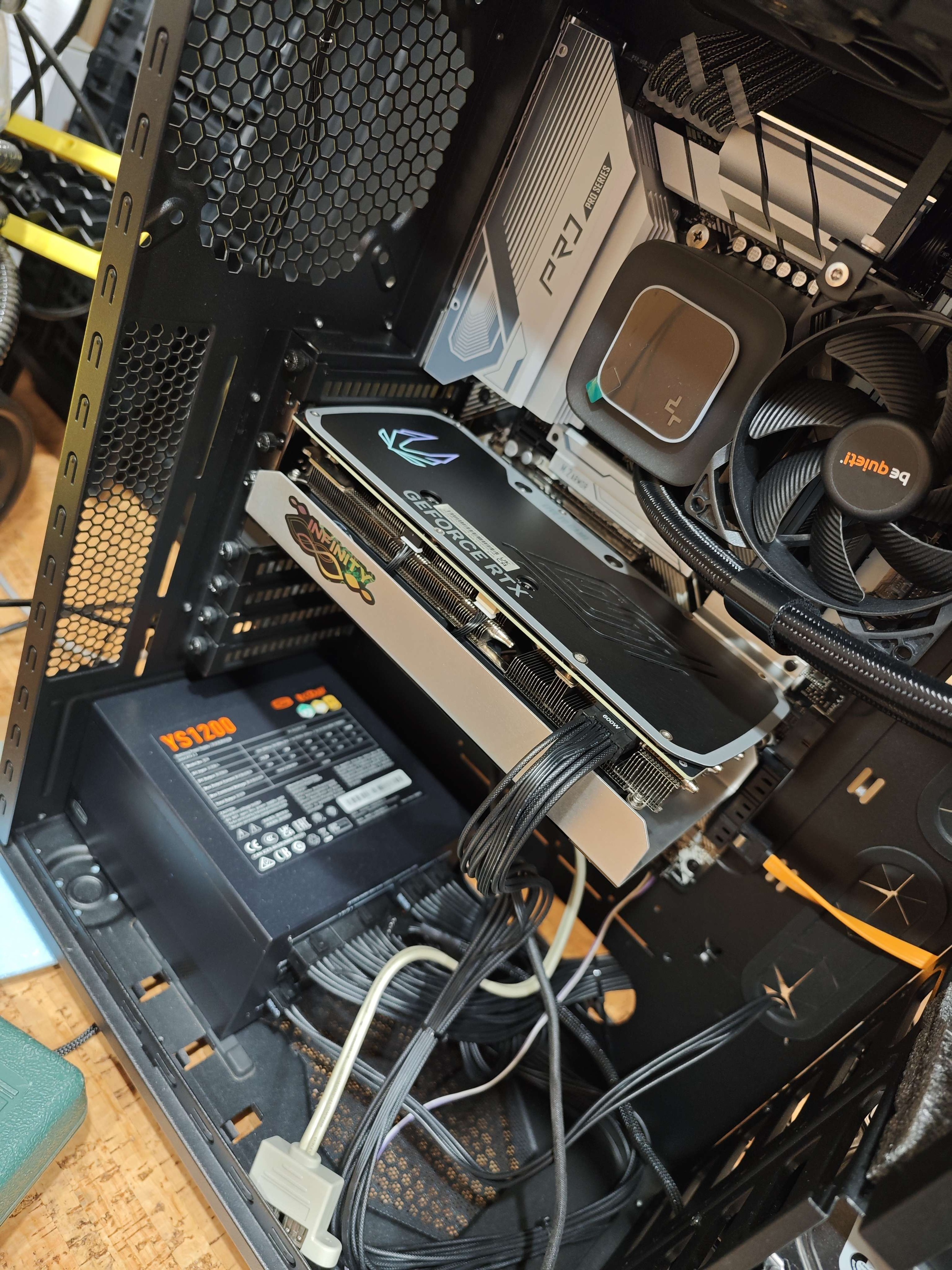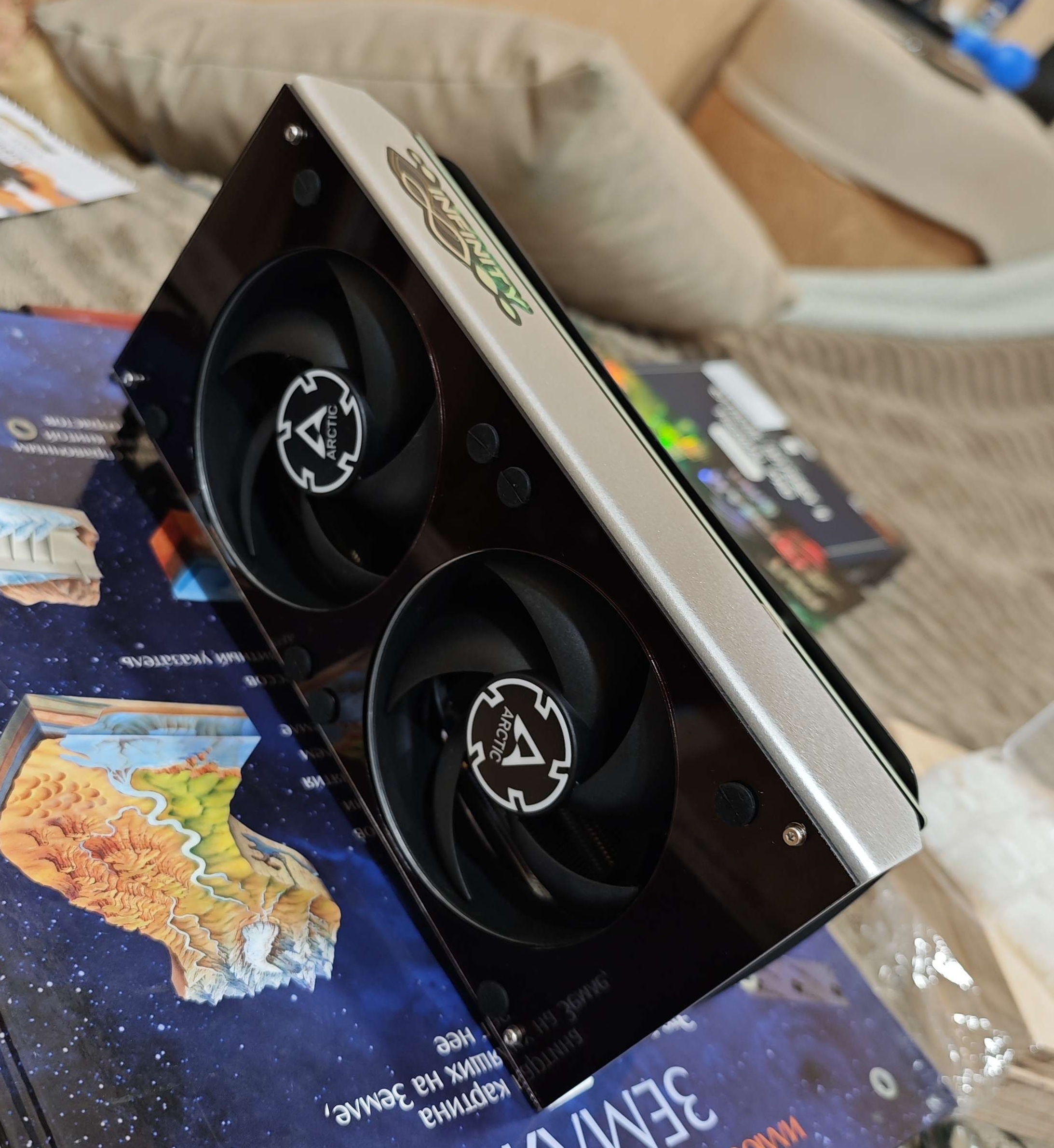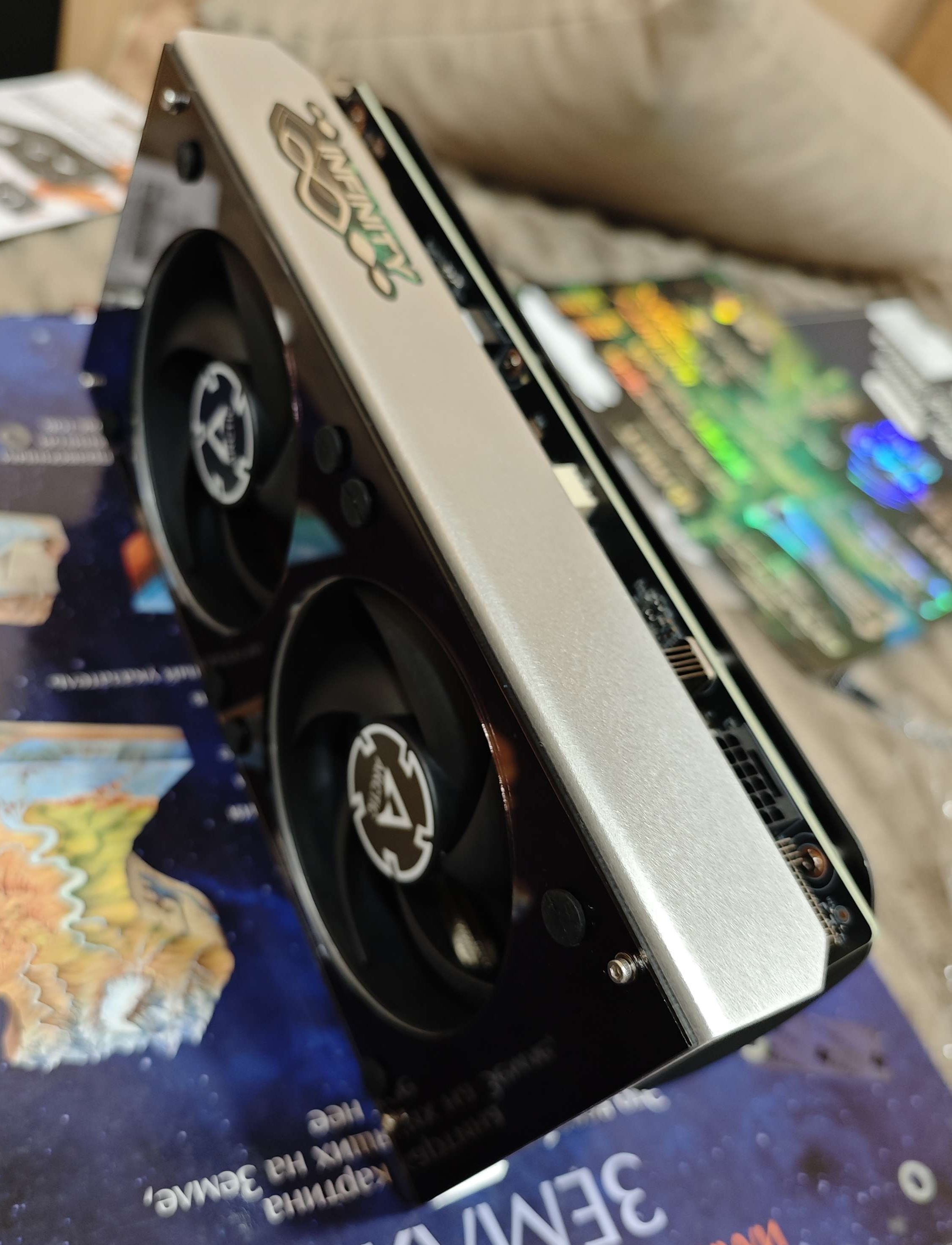 15 град дельта на новой палит дуал 4070 в фурмарке, тоже чип кривой. После смены пасты на 7950 сначала 17 град даже в суперпозишине, через 2 дня жарева и проб разгона дельта 12-13 град, но по чипу с родной пастой разницы практически нет, может +- 1-2град. Замена родных термух на фехонду дополнительно скинула с памяти 6-7 град, 120 вентиль на 1000 об, дующий на плату со стороны снятого бэкплейта(при родных вентилях) убирает 20 град с текстолита в районе питальника 60град -> 40 град(мерял пирометром), плюс убирает ~2 град с памяти и чипа. 2х120 арктика Р12 на максимальных 1600об тише, чем палитовские вентили на 35%, плюс с ними текстолит 47 град в нагрузке, вместо 60 град при 55% на штатных. Жду запчасти и буду стационарно колхозить 2х120х25 на радик и 1(2?)120х15 со стороны бекплейта