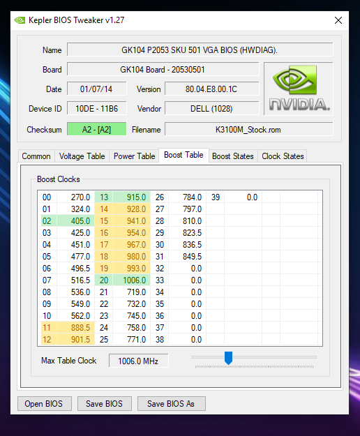 Информация от участника темы: Аффторитет Приведу пример как разгонять карты 970/980/980ti по таблице буст частот. Не буду писать как бекапить/сохранять биос, как и какие ставить поверлимиты - все это есть в шапке темы в инструкции по разгону. Образцом к материалу будет моя MSI GTX970 gamming 100ME. Поиграл я с разгоном в Afterburner-e и решил зашить разгон в биос. Задача разогнать карту бустом до 1506МГц при напруге в 1.231в. Начинаем.