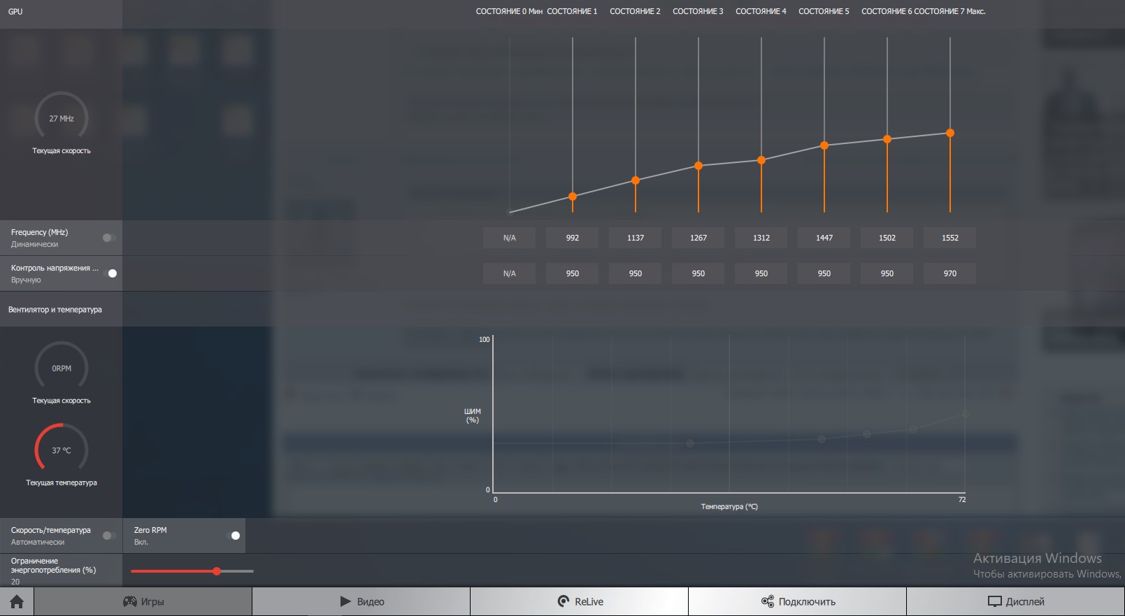 Здорово... На твоем скрине в Ведьмак видно, что память у тебя стоит 700Mhz, а это значит, что реальная напруга не 800, а 900+-, потому как, 700 соответствует напряжению 900 mv., не Должно быть так, что бы память была выше чипа по напруге, иначе вольтаж идет по самому высокому показателю, у тебя это Memory P2 700/900. Это 99.9... проверено и не раз))) загрузи HWiNFO64, и включи мониторинг частоты и вольтажа на чипе, а потом запусти Ведьмака и прогони мин 5, и посмотри графики, что получится... 800mv и рядом не будет не говоря уже о меньшем...