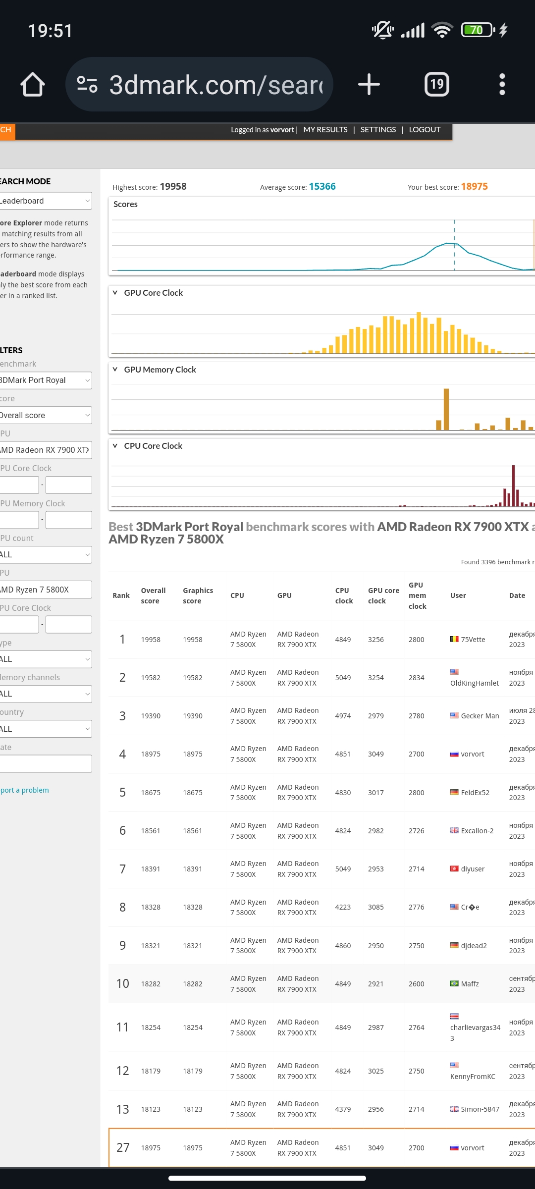 Ищи лучше, в 3DMark кнопка Search. Выбираешь там 5800X, потом 7900XTX, жмешь Leaderboard в верхнем левом углу.