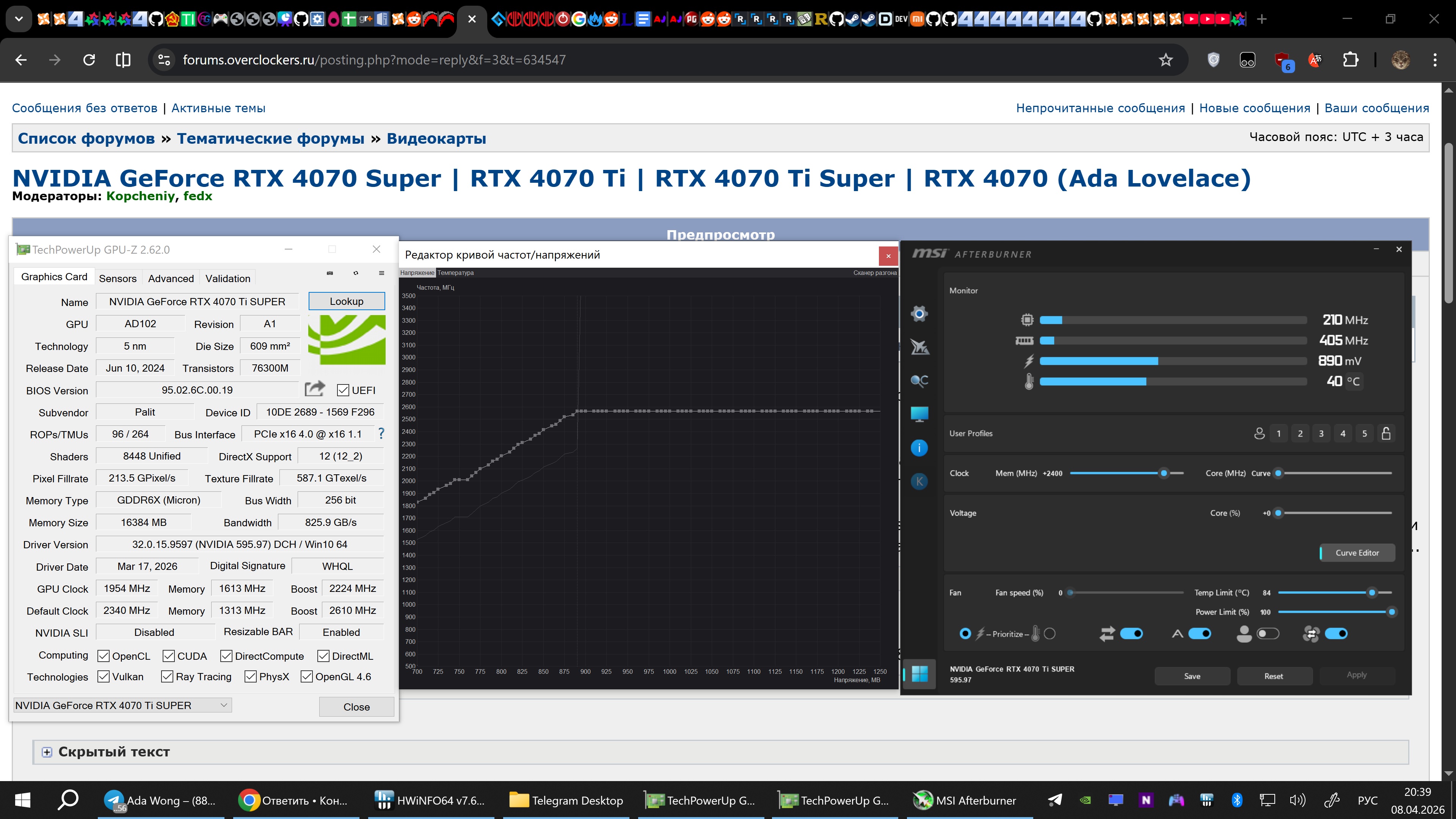 Ну у меня 4070 ti super (чип от 4090 и соответственно и плата и охлад) с жирным охладом в 2кг от 4090 и юзаю в максимальном андервольте её (вся кривая поднят на +300 и обрезана на - 2590/0.885v +2450 видеопамять (это +15 ватт лишних к жору)), потому что: