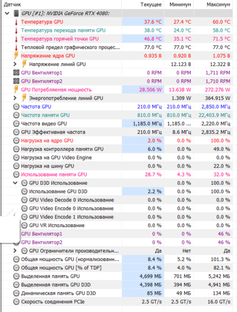 по температуре в простое У меня два монитора с разной герцовкой - 200 и 60 гц. Изза этого частота памяти не всегда на минимуме, а частенько туда сюда между мин и макс летает. Бывает до 28 ватт показывает на раб столе.