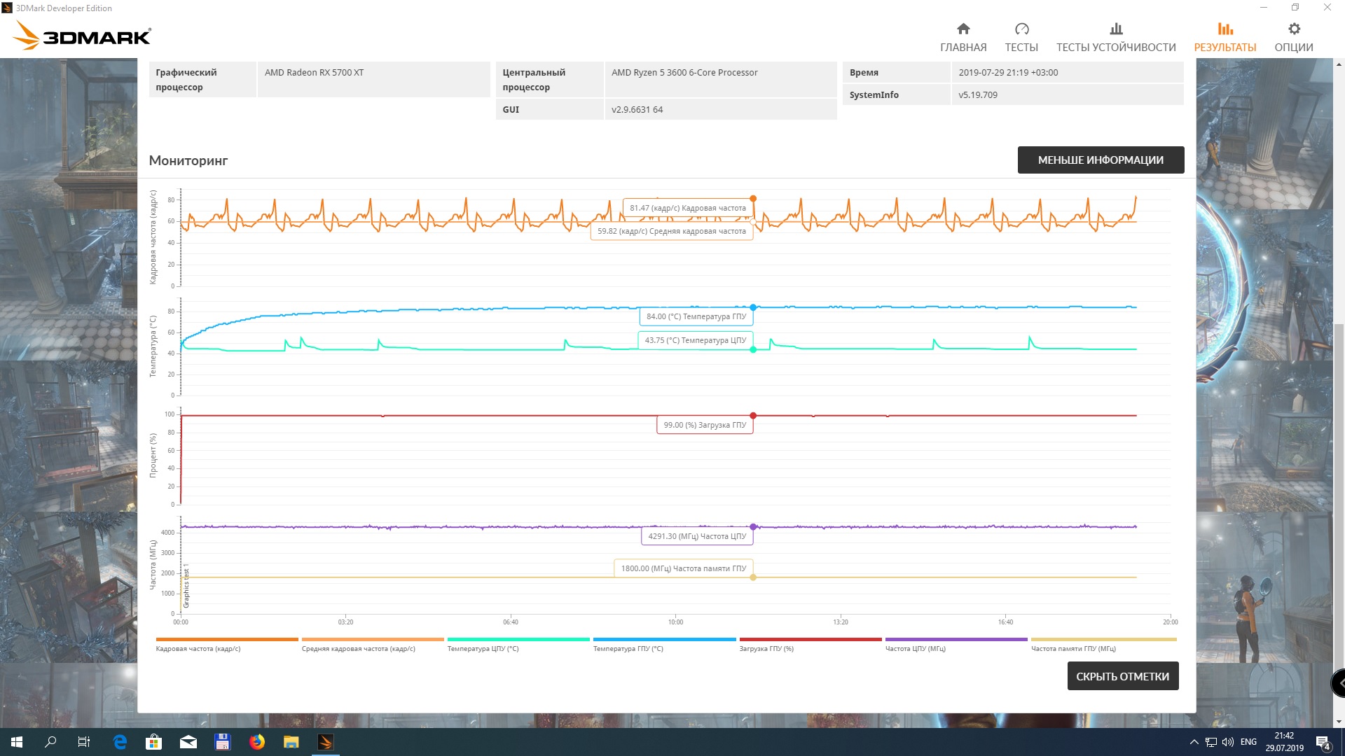 .. В случае со старшей моделью, оснащенной чипами Samsung K4Z80325BC-H14, даже пришлось пожертвовать теми достижениями, которые мы получили в основном обзоре новинок, и удовлетвориться результирующей пропускной способность 14,4 Гбит/с. Radeon RX 5700, напротив, позволил разогнать память (чипы Micron 9GA77 D9WCW) лучше, чем прежде — до 14,8 Гбит/с.
