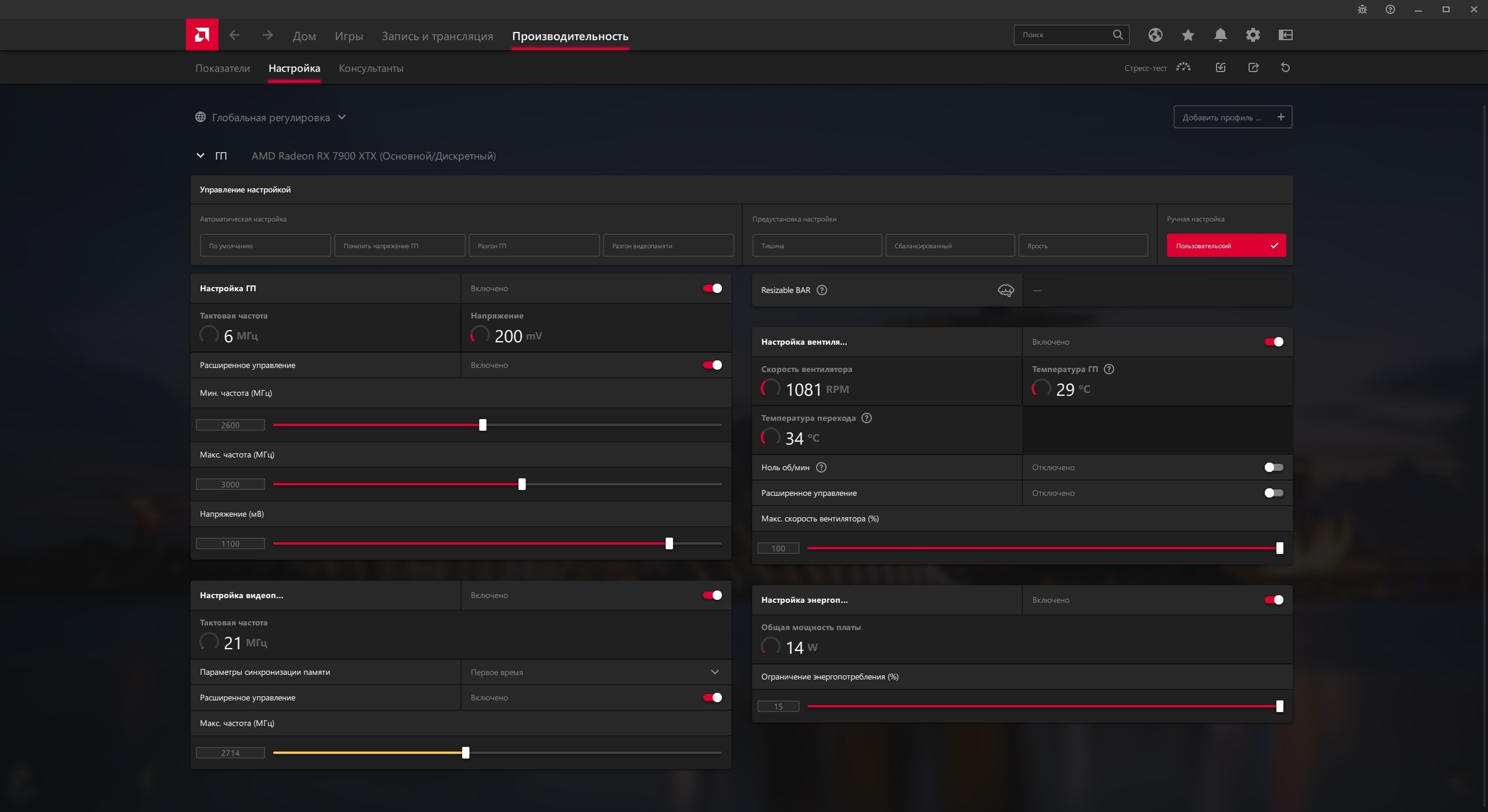 1.Как разогнать видеокарты Radeon 7000-й серии? Важной особенностью архитектуры RDNA3 является то, что разгон GPU даёт линейный прирост fps в играх до 2800 МГц. Т. е. на сколько % разогнали, столько % прирост fps в играх получили. После 2800 МГц линейность разгона теряется, и как не гони и не повышай частоты, Power Limit, прирост fps в играх составляет всего 4-5%. Об этом рассказано в этом обзоре https://overclockers.ru/blog/Vorvort/show/121115/obzor-i-testirovanie-videokarty-asrock-radeon-rx-7900xtx-aqua, раздел Нюансы разгона, где оверклокеры, с помощью множества тестов, выяснили подробности. В синтетических бенчмарках порога в 2800 МГц нет, разгон линейный на любых частотах. Обновление: у одного из владельцев 7900XTX линейный разгон в играх после 2800 МГц GPU, но для этого он разогнал GDDR6 до 2800 МГц. Так как же разогнать Radeon 7000-й серии? Хорошие результаты даёт комплексный разгон GPU и GDDR6. Например на моей видеокарте разгон GPU до 2852 МГц и GDDR6 до 2700 Мгц дал прирост fps 12% в играх, в сравнении с референсными частотами 2500 МГц GPU 2500 МГц GDDR6. Вершиной разгона является андервольтинг. Если вам удалось после разгона снизить напряжение на GPU без потери производительности - поздравляю! Вы сделали очень удачный разгон. 2. Как сделать андервольтинг? У видеокарт Radeon 7000-й серии вольтаж на GPU часто завышен с завода. Снизив напряжение на GPU в драйвере Radeon Software пользователь может уменьшить энергопотребление и нагрев видеокарты без потери производительности. Единственный нюанс - не все игры работают на сниженном для GPU напряжении. Например у меня Radeon 7900XTX в игре Baldurs Gate 3, в 4К ультра, работает на 1.05 В, а в игре Division 2, 4К, кастом настройки (тяжелее Макс.) для GPU требуется 1.12 В. Ещё одним важным инструментом андервольтинга является снижение Power Limit видеокарты. Иногда у геймера в игре очень много fps и ему не нужны избыточные энергопотребление и нагрев видеокарты. Он ограничивает в драйвере Radeon Software Power Limit видеокарты, снижая указанные параметры под нагрузкой, зачастую не теряя производительность в играх. Пользователь может сочетать оба инструмента для андервольтинга, получая отличные результаты. 3. Как решить проблемы штатной эксплуатации "воздушных" Radeon 7900XTX при перегреве hot spot? В теме были жалобы владельцев Radeon RX 7900XTX на перегрев hot spot при штатной эксплуатации. Проблема заключалась в штатном термоинтерфейсе, который выдавливало радиатором системы охлаждения. Решается она заменой штатного термоинтерфейса на термопасту с фазовым переходом. Автор F. A. Q. не несёт ответственности за манипуляции с видеокартами, пользователи делают их на свой страх и риск. 4. В каких играх Radeon RX 7900XTX показывает высокую производительность в 4К с ультра настройками? (без RTX Nvidia) 15 проектов, где 7900XTX была на равных или минимально отставала от 4090: AC: Odyssey, Far Cry 6, AC: Valhalla, Cyberpunk 2077, RDR2, CoD: MW2, Remnant 2, Hogwarts Legacy, Starfield, BG3, Immortals of Aveum, Ratchet & Clank: Rift Apart, Fortnite (DX12, HW RT, Nanite epic, Lumen epic), Horizon Forbidden West, Dragon's Dogma 2. С трассировкой лучей и высоким fps в 4K ультра на Radeon RX 7900XTX можно поиграть только в Doom Eternal, Marvel's Spiderman remaster, Far Cry 6.