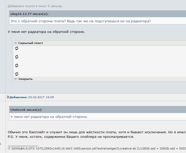 Обычно это бэкплейт и служит он лишь для жёсткости платы, хотя и бывают исключения. Но я имел ввиду именно "рабочий" радиатор. Ведь там же довольно узкий промежуток остаётся, плюс, зачастую, конкретно выступающая терможвачка на памяти мешает "боковому" доступу? P.S. У меня, кстати, содержимое Вашего спойлера не просматривается.