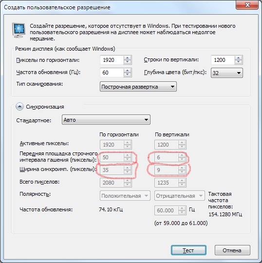 Сегодня подошла к концу история с погасаниями экрана на GIGABYTE-GV-N780GHZ-3GD. Проблема решилась через панель управления драйверов NVIDIA. На вкладке "изменение разрешения" нажимаем на кнопку "настройка". После чего появляется окно с заголовком "создать пользовательское разрешение". Внутри этого окна я менял параметры строчных и кадровых синхроимпульсов в большую сторону, которые на картинке выделены красным цветом.