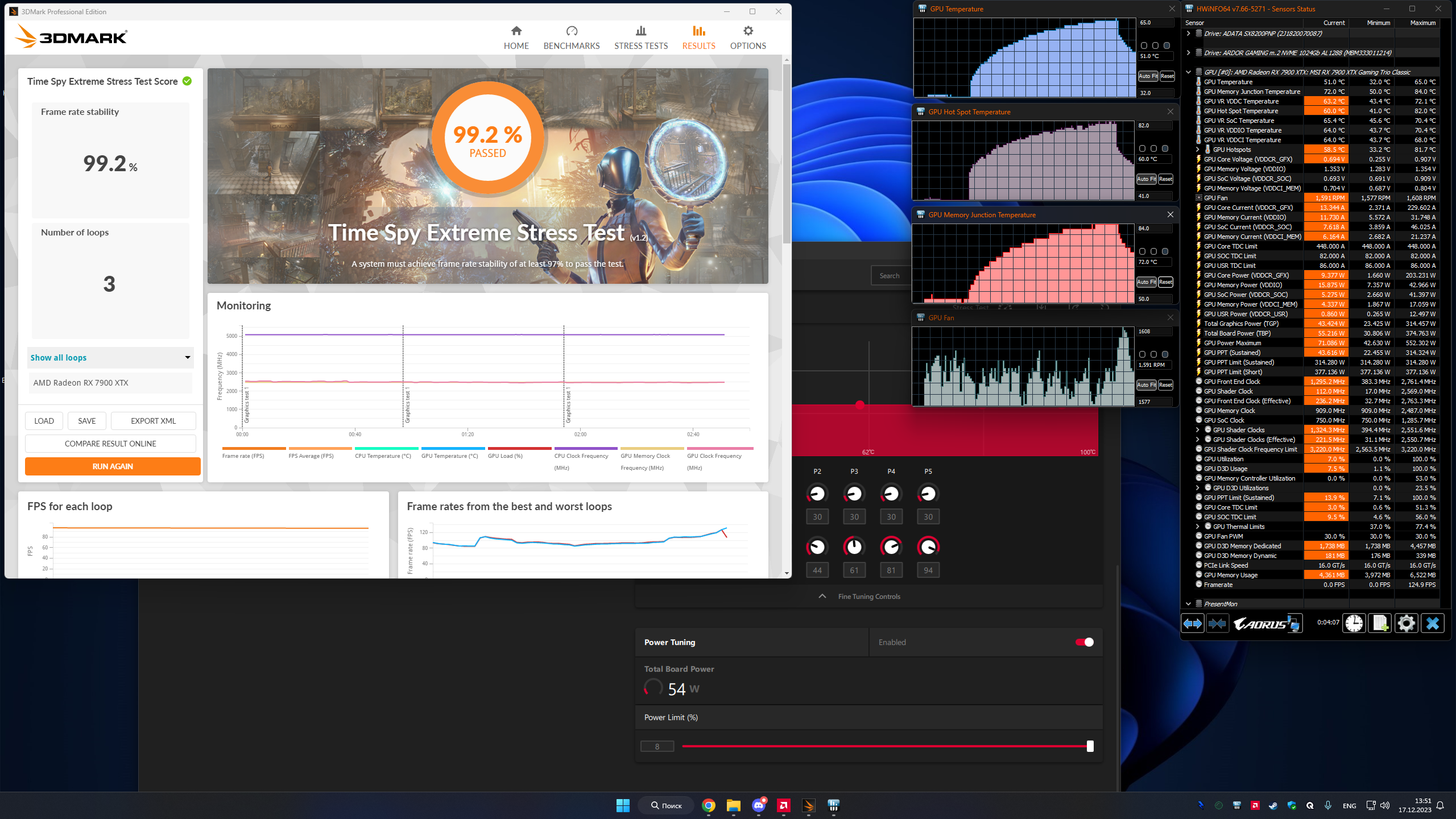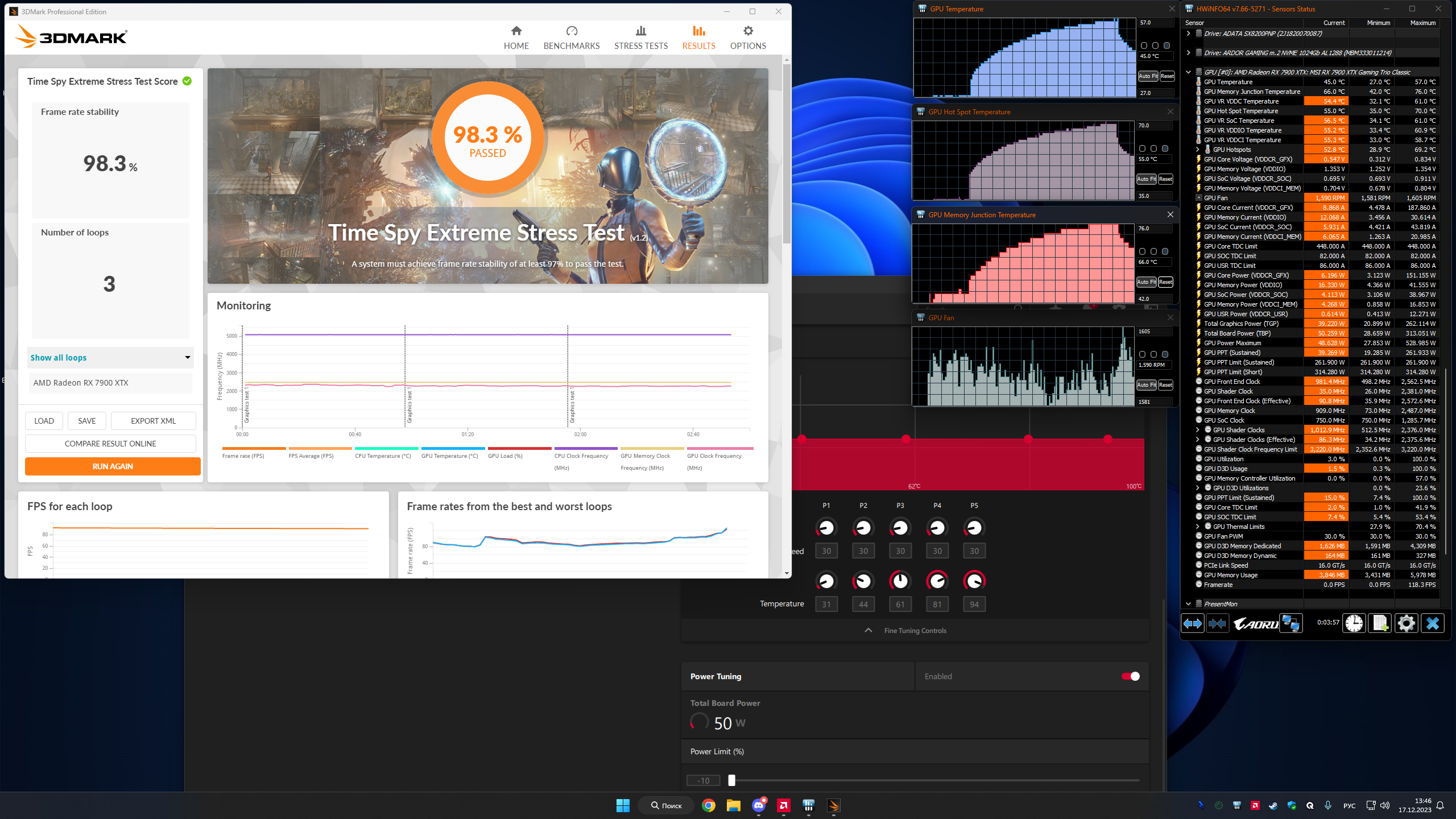 Прогнал три раза бенч 3DMark SpeedWay на XTX MSI Trio, результат плюс минус похожий всегда - ~6180 попугаев. Частота ГПУ во время теста находилась в диапазоне 2400-2450 МГц.