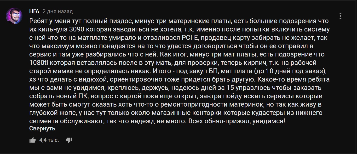 Andrevlinsuperpash я думаю, что это может быть вариантом выхода БП из строя. Только, в это случае он пару материнок еще с собой взял. Не факт, что это стример криворукий. Просто, что-то не так с 3090... раз такое творится.