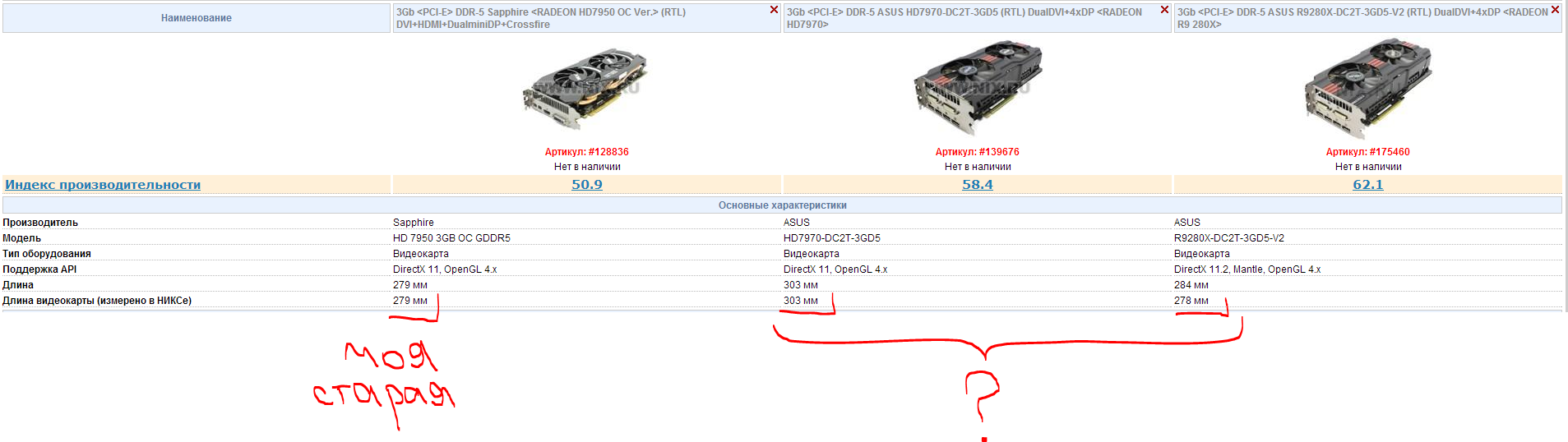 Все, заказал, приедет 6 декабря, но у меня возник вопрос опять же с размером в длину , ниже сделал скрин с никса с размерами, моя которая стояла стоит там первая(ее фото приложил, и если по размеру 280x такая как написана, то она точно войдет в корпус), потом идет 7970 DCIIT а потом уже моя которую я заказал, возникает вопрос, почему у асусов размеры так отличаются если все твердят что это две одинаковых платы......???? кто что скажет? И еще, вот у саппфир кулер выступал очень сильно от платы в длину, дак вот 279мм интересно это с пластиком или только текстолит???, приходилось сначало видеокарту заносить вправо, потом только вставлять....