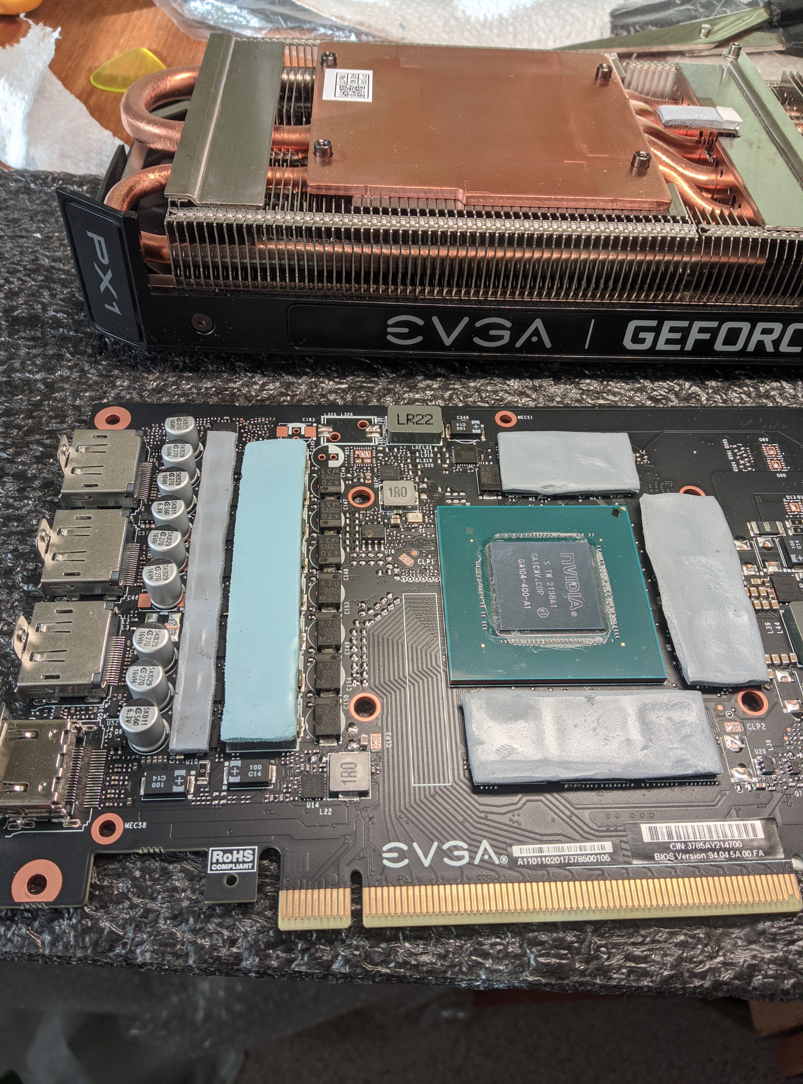 Нашёл инфу как по термопссте так и термопрокладкам даже что использует Евга прокладки Laird Tflex 300 плотностью 1,2 Вт/мК. Термопаста ShinEtsu 3w/mk, на памяти Тп 2,25 толщина