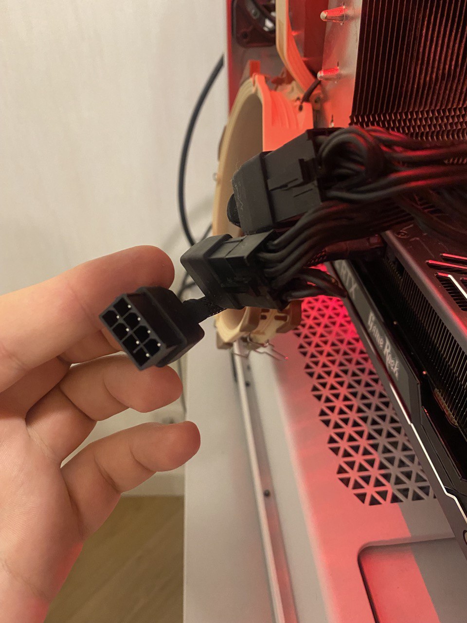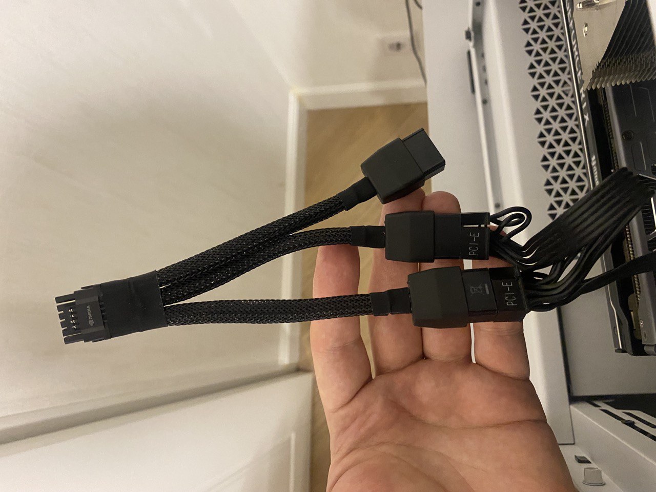 я правильно понимаю, что ты хочешь рисковать картой за 100к, жалея 1к на новый провод если не хватает, или 5к на новый БП ? мне так интересно просто. Наверное не дураки 3х8pin сделали-то переходник, есть подозрение, что третий 8pin все таки нужен. Не считая того, что у тебя 6+2 pin и из-за кривого переходника 2pin часть сильно изогнута и отходит от 6pin. Стяжкой зажми, чтобы нормальное соединение было.