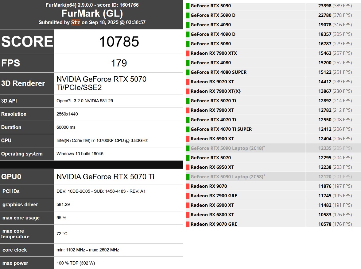 Эх, купил себе на голову проблем Решил протестировать свой обогреватель Gigabyte Windforce OC SFF 5070 Ti в FurMark2 Короче, получил результат, что моя 5070ti прилично так хуже 5070 (получаю 179fps, когда как 5070 - 204fps). То ли лыжи не едут, то ли я ничего не понимаю. Есть идеи? Карта в стоке из коробки, BIOS - Performance.