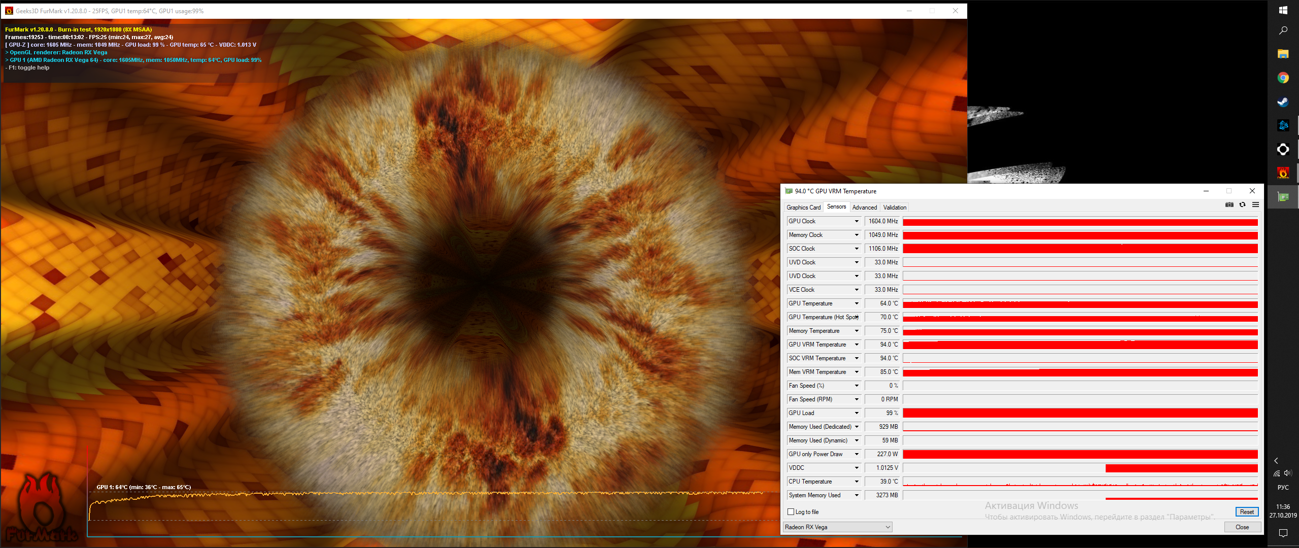 Добрый день. Имею NITRO+ RX VEGA56. Не разбиралась. Температуры выше 67 не поднимались. Не разгонял. БИОС не шил. Работала как часы. Вчера начались проблемы: Сидел себе, играл в War Thunder. Один раз за два часа свернуло игру на рабочий стол и развернуло обратно. Я не придал этому значения. Сделал перерыв на просмотр фильма. Затем, снова запустил игру. Минут через 10 свернуло на рабочий стол с зависанием и артефактами, причём в клиенте успело написать, что текстуры упрощены и т.п. Перезагрузился - та же проблема. Скачал свежие драйвера. Выполнил чистую установку - настройки драйвера не открылись, так, как написано было, что железяка не определилась. GPU-Z так же показал пустоту. Переустановил драйвера заново. Встали в этот раз нормально, и GPU-Z показывать стал то, что нужно. На рабочем столе и при просмотре фильмов проблем нет. Только запускаю какой-нить бенчмарк или игру - лютые артефакты. Запустил ОССТ на тест видеопамяти - около 1000 ошибок. Кстати. Запустил бублик в ОССТ - проходит нормально. Позже, через пол-дня, запустил тесты Valley и Superposition - прошло все. Запустил вар Тандер опять - хватило на минут сорок и опять потом та же кухня. Клиент сообщает при этом, что снижено качество текстур из-за нехватки видеопамяти. Тест памяти ОССТ показывает уже десятки тысяч ошибок. Подождал пол-часа. Снизил настройки Вар Тандера - два часа ужё всё норм. Пробовал Chernobylite, который раньше шёл на ультрах спокойно - виснет намертво.