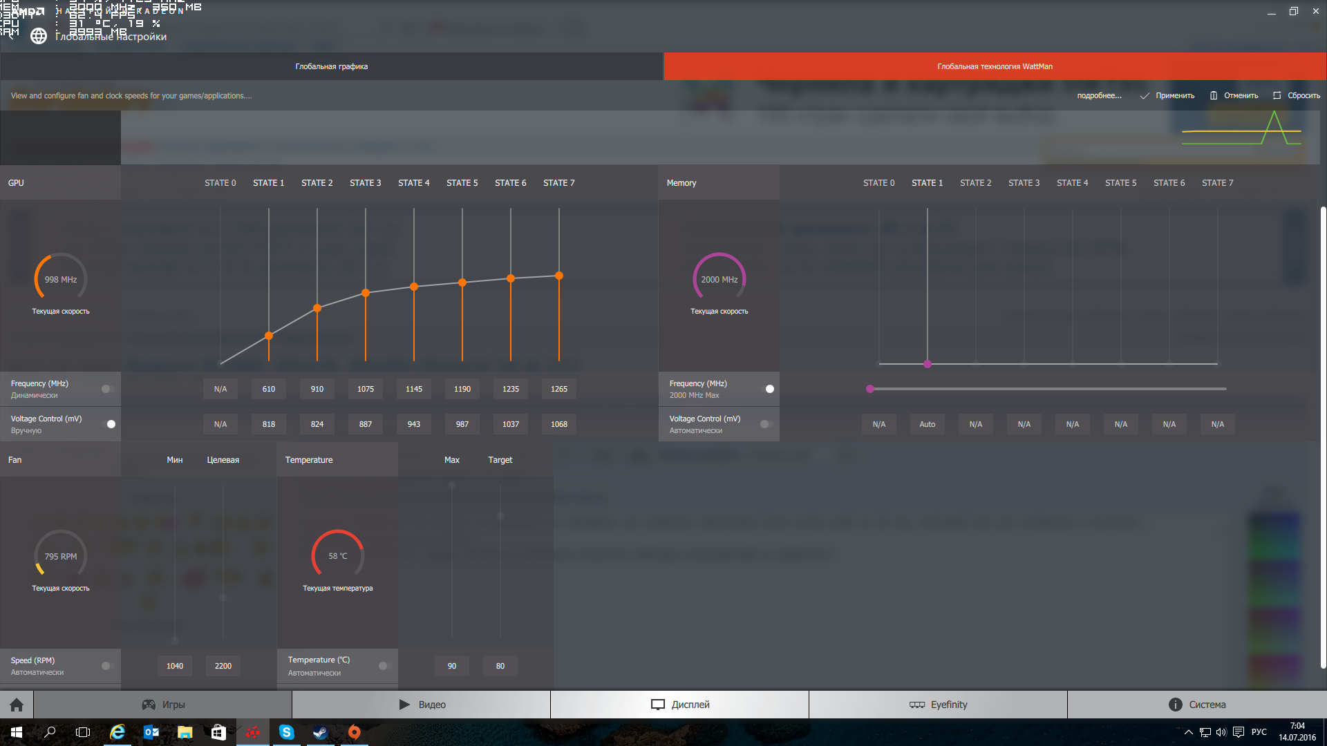 Q: Постоянно скачет частота памяти (или не снижается) в простое. A: При броузинге интернетов используется аппаратное ускорение - повышаются частоты чипа и памяти на некоторое время. Так же если у вас ДВА монитора, то частота памяти не будет снижается. Аналогичная ситуация для 144Гц мониторов.