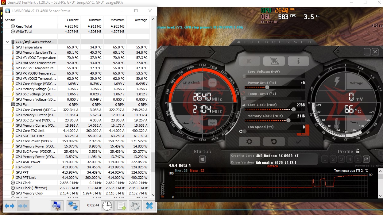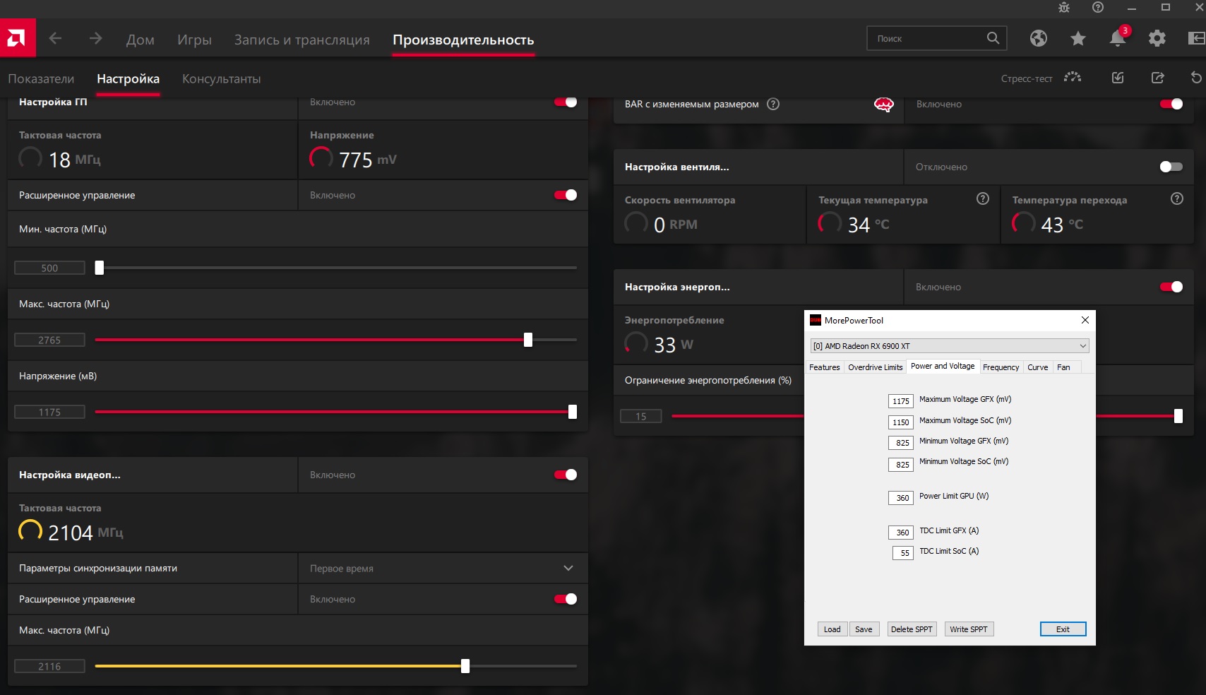приехала моя NITRO+ RX 6900 XT SE, карта понравилась, на автомате бесшумная но хотспот в марке до 96 доходил. При 2800 оборотах так вообще около 80 но шум как от вертолета. ну и Поразгонял немного, что любопытно при 1.1в марк не прошел вылетел, ставил частоты мин 2200 и макс 2600 на стоке и на них уже покрутилася без проблем. ЧТО еще более удивительно стресс тест 1в проходит. r-bar на z390 без проблем активировался.