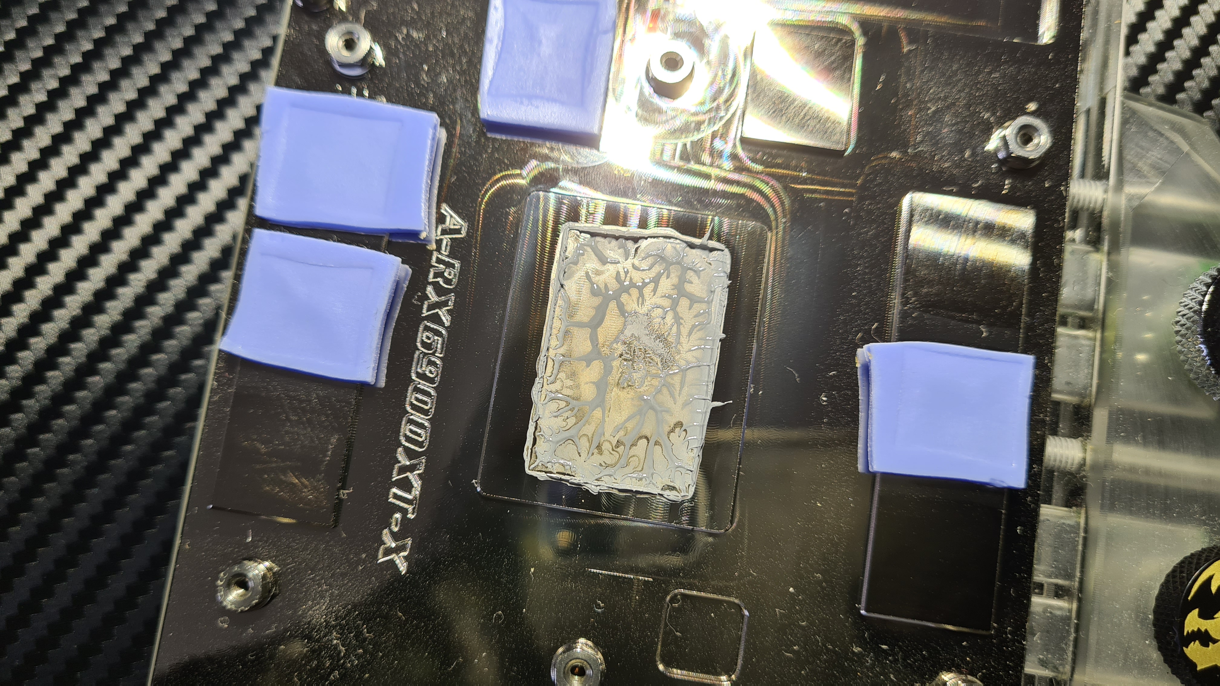 вот MX4 у меня "сдулась" через 2-3 месяца. перемазал на THERMALRIGHT TF8 - все ок. ну либо я неправильно собрал - грешу на синенькую прокладку, которая могла случайно попасть "не туда, куда надо" , из-за чего не было полноценного прижима. вот отпечаток MX4 после разбора: