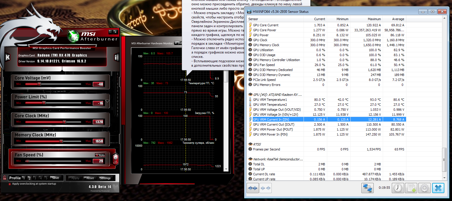 MSI RX 470 GAMING X 8G. 1320 по ядру, 1650 по памяти. Asic 84,2%. Напряжение - 1025-1031 mV. После 20 минут Ведьмак 3(Настройки ультра, дальность прорисовки высокая, волосы выключены, фпс в среднем 65). Температура по чипу 71-73 С. Температура ВРМ - до 93 градусов. Обороты вентилятора 1950-2000 рпм. При меньших оборотах ВРМ греется сильнее.