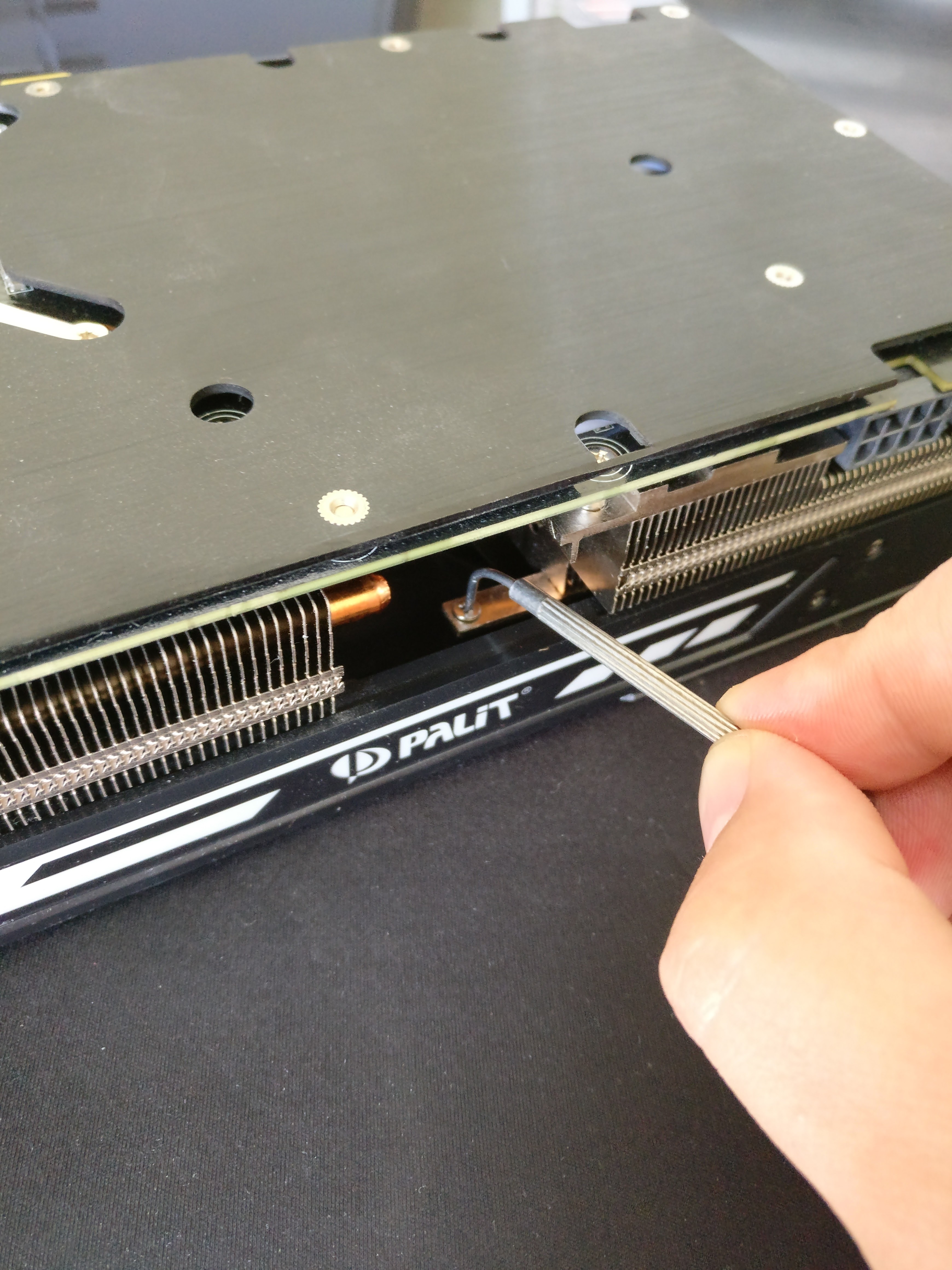 В общем тоже решил сделать "Lüftermod" своему Palit 1080 Ti SuperJetstream. Проблема глубоко посаженных винтов крепления решилась согнутой тонкой отверткой.