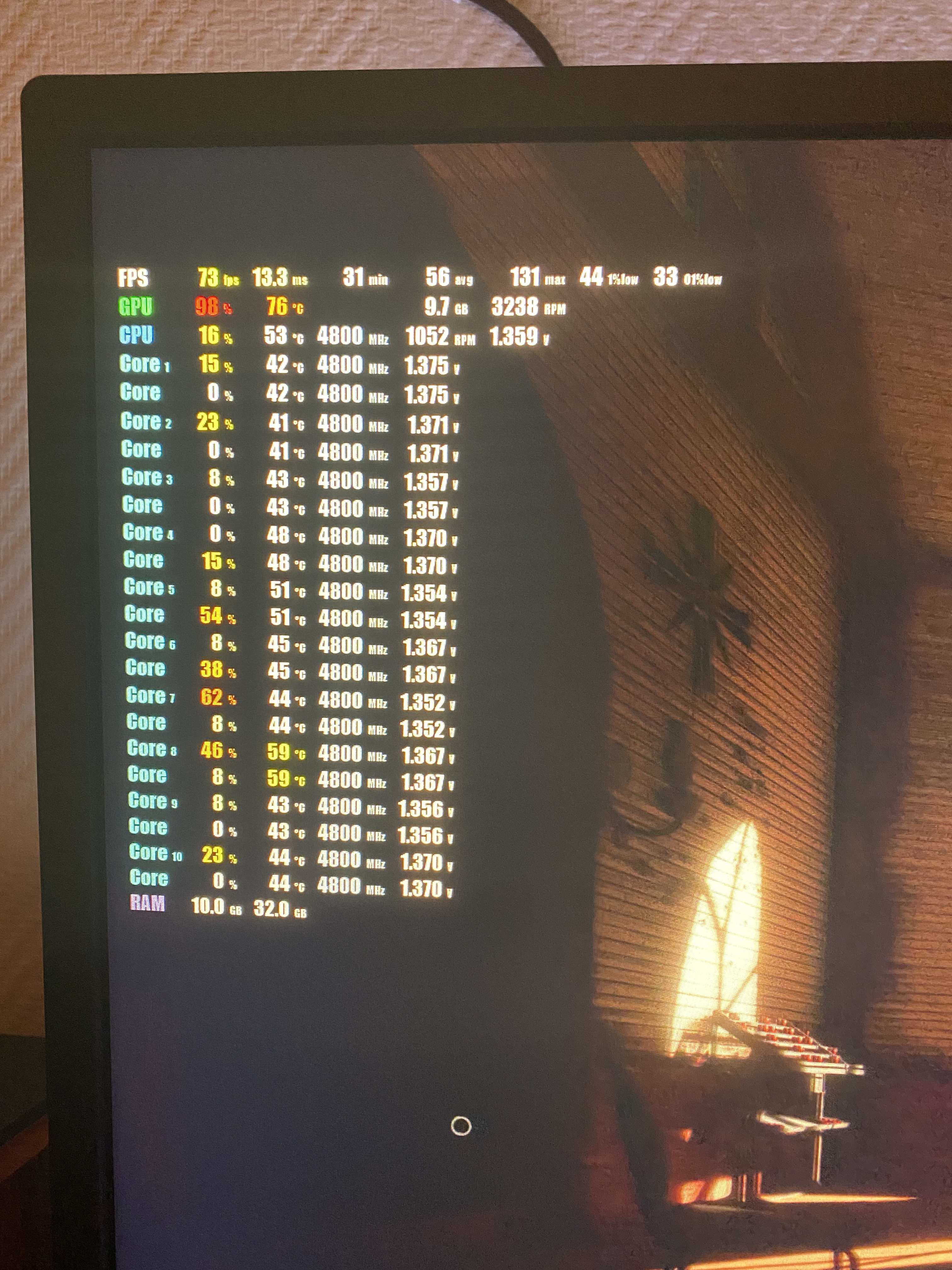 (видеокарта реф, в стоке, кроме вентиляторов, они на 100% настроены), процессор в стоке, ОЗУ что в XMP, что в стоке пробовал проблема сохраняется (прогонял стандартной утилитой win10 , проверка памяти, около суток тестировалось- без проблем, прогонял тм5 extreme@anta777, 2 прохода подряд- без проблем) как в стоке так и в XMP всё хорошо, температура ОЗУ около 40-42 градусов. Показатели в играх такие за 5 минут