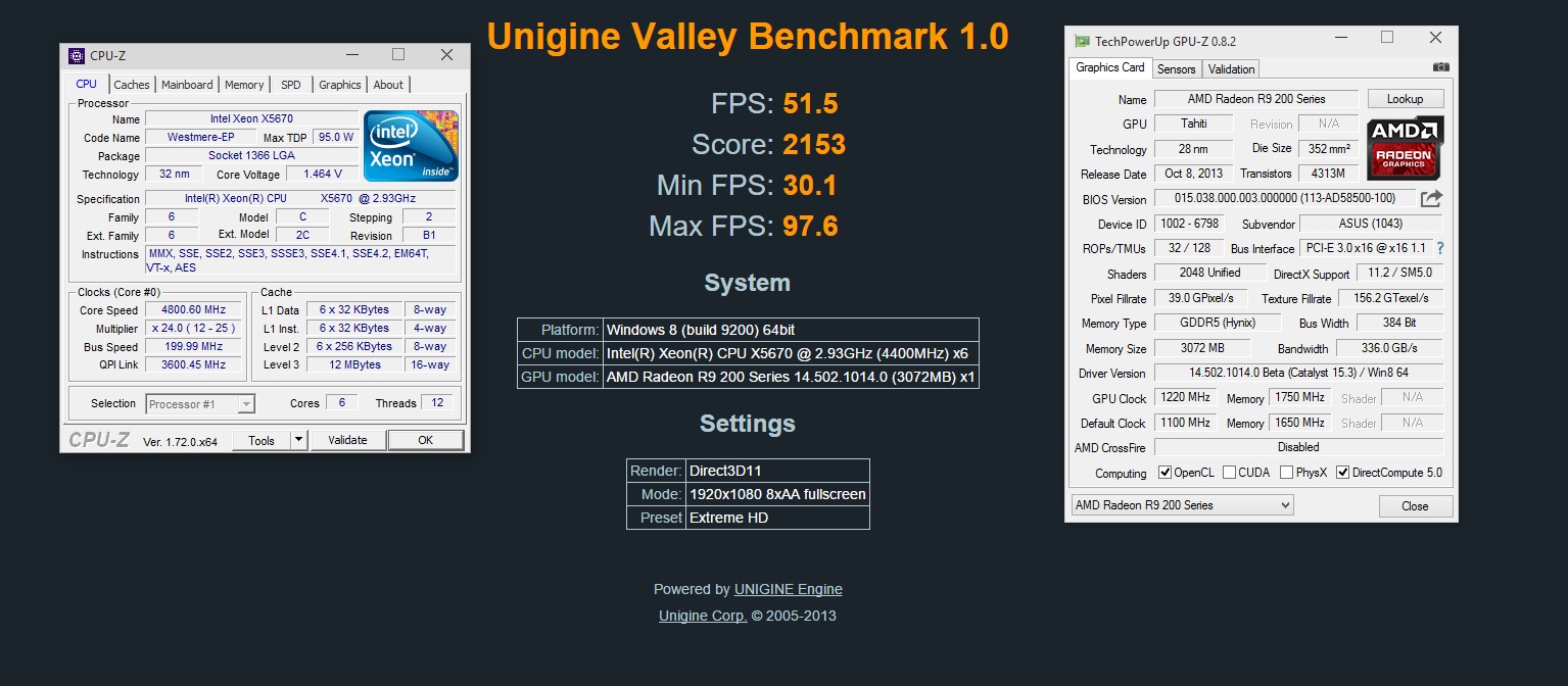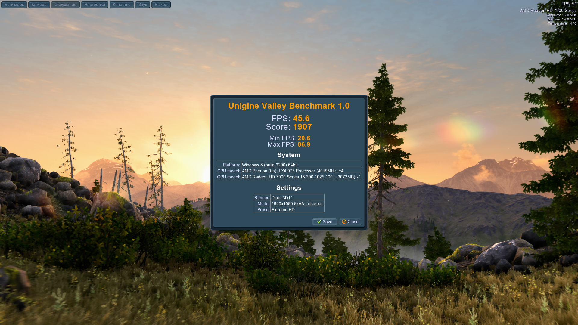 ну у меня включив виртуальное сверх высокое разрешение, чтобы запустить фулл хд, примерно такие результаты на 7970 в немножко похожем разгоне, ток проц другой, ну он и правда играет очень малую роль в этом тесте, например это можно понять по этому видео https://www.youtube.com/watch?v=gzWdJrLE66o или посмотрев загрузку цп во время теста