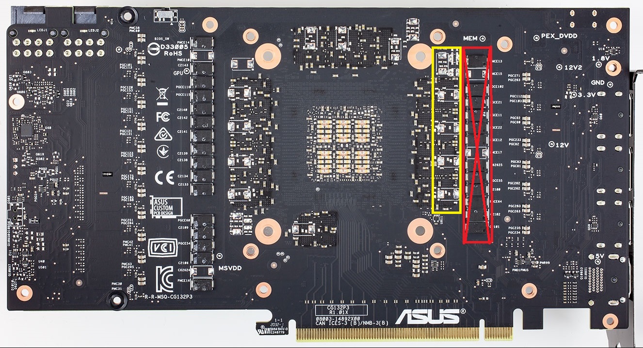 Заметил, что на моём экземпляре на задней части PCB не контактирует термапрокладка с кондёрами. Термопрокладка приклеена к бекплейту и между кондёрами и ней зазор в 1-1.5мм.