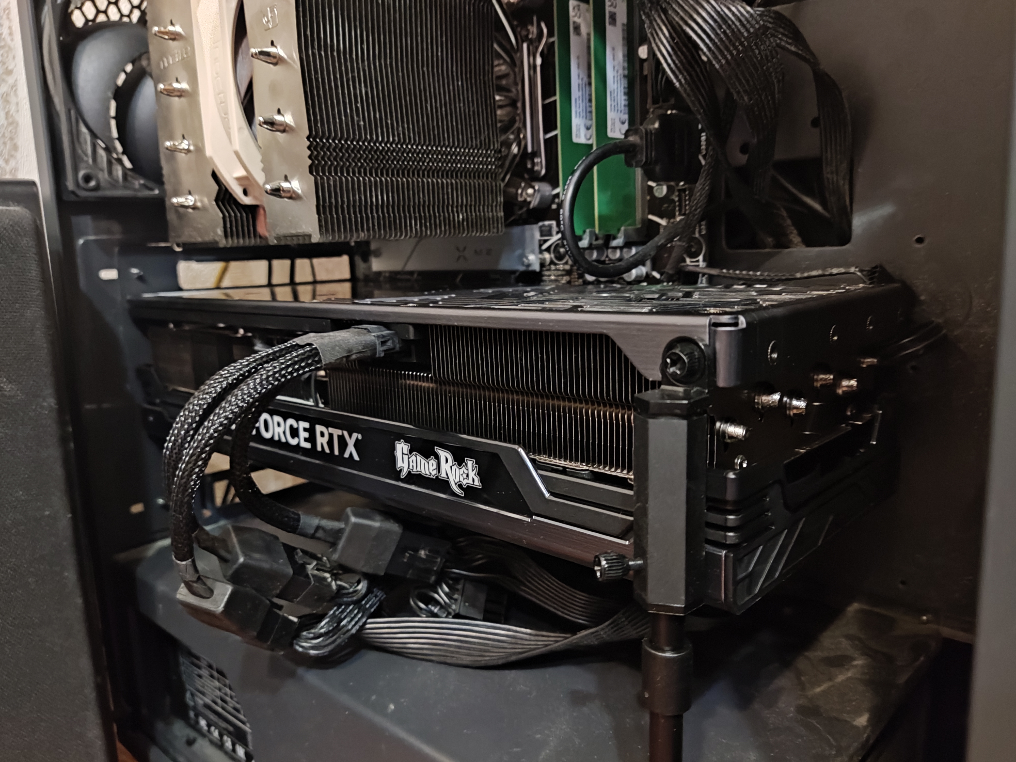 Забрал с Озона от казахского филиала, 4080 GameRock. Взял с хорошей скидкой, за 89.5 т.р., за надорванную коробку. Изначально хотел 4070 Ti, но цены падают на нее медленно, а доллар начал расти. Как и предполагалось, если ставить стекло, придется сильно сгибать переходник. Понравился держатель карты.