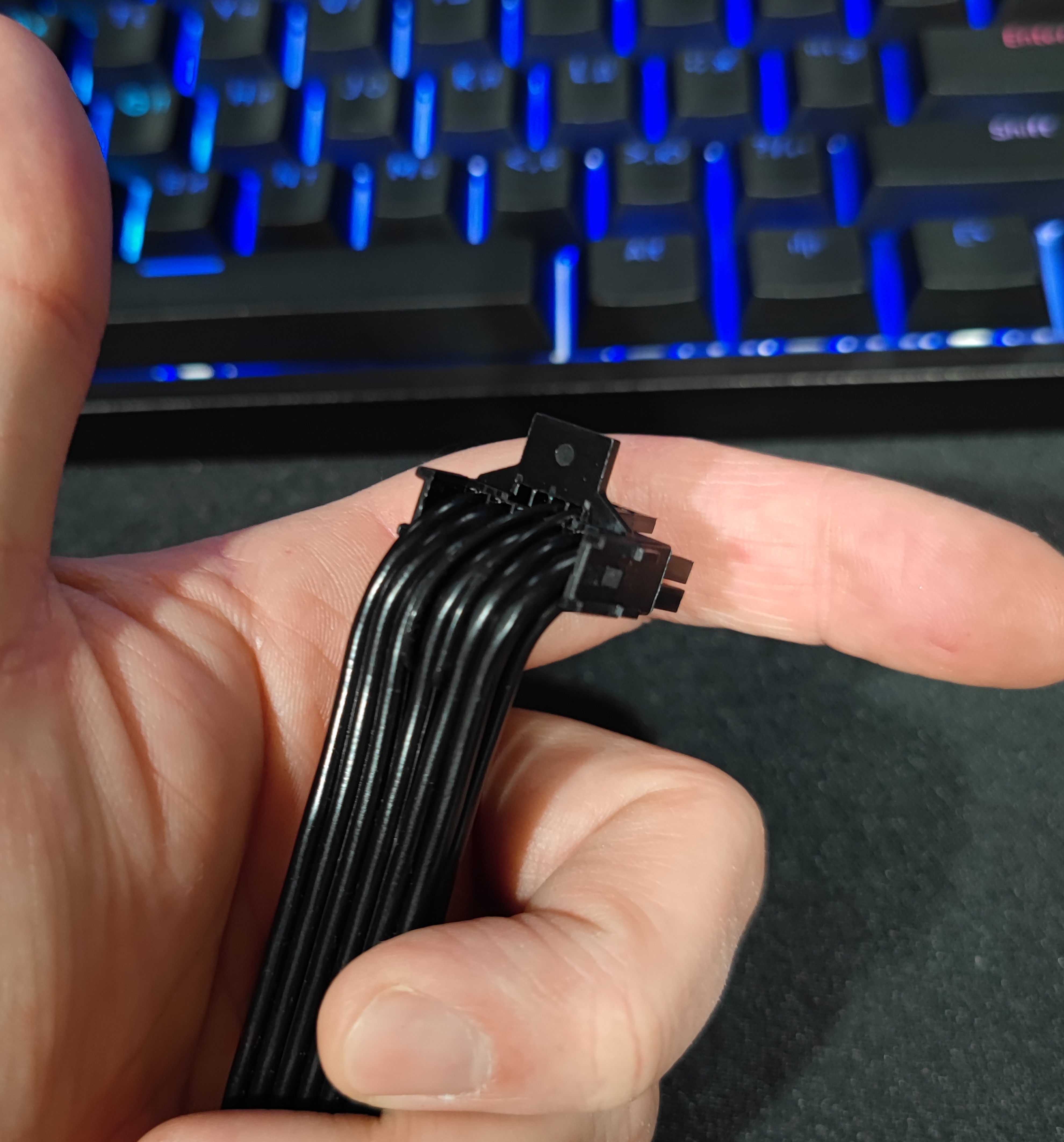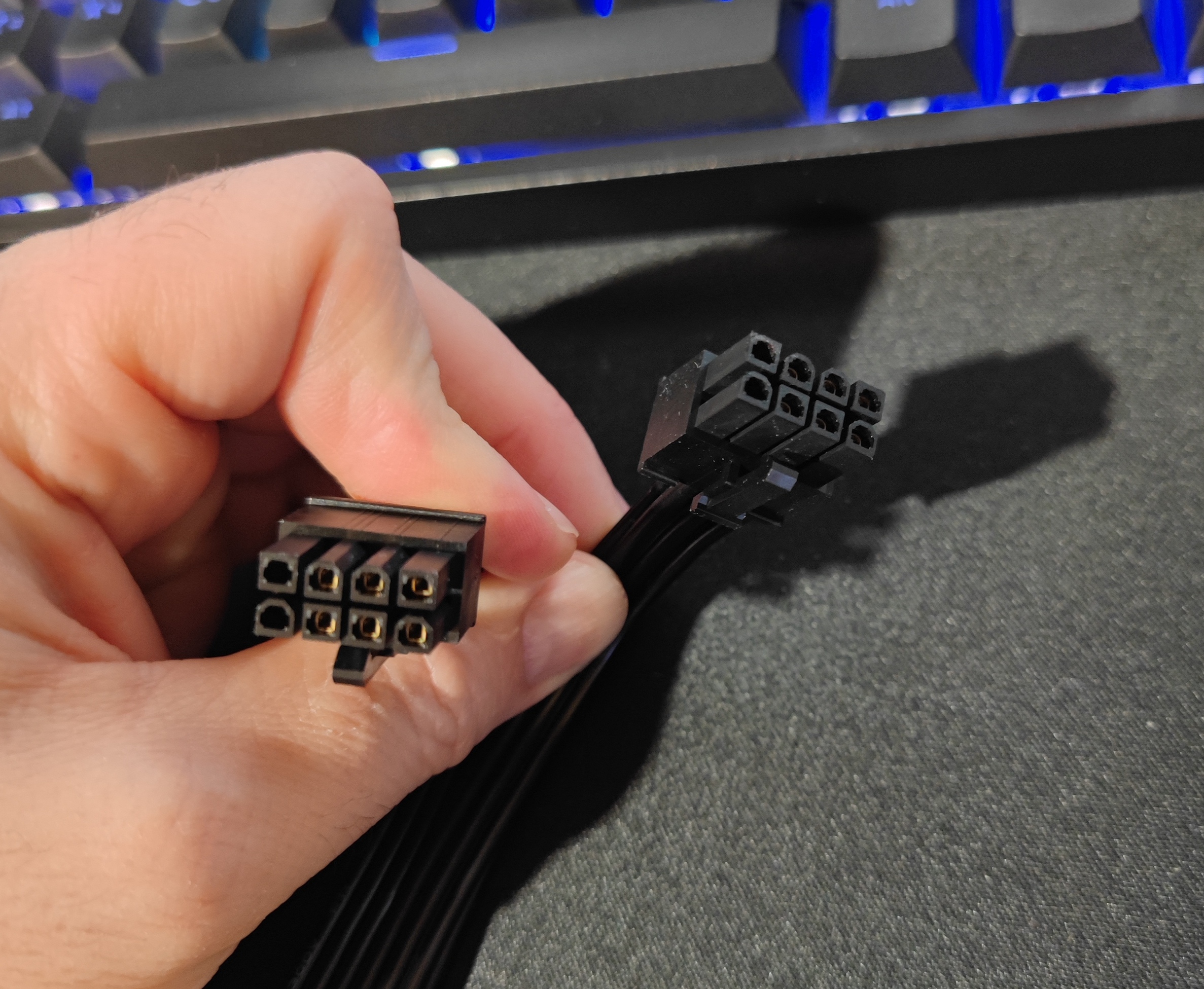 Пришли кабели 12пин, с "угловым" коннектором. По фото не понравилось качество 8-пин частей, но оно очень хорошее. Как и сам 12 пин тоже довольно высокого качества. Провода 16-ые, кабель тяжеленький. В сравнении с другим китайским, который одним из первых появился на алике, 12 пин часть понравилась больше, особенно пинами - они "православные", с один разрезом, все стоят ровно, без перекрута, в отличие от другого китая, сам пластик тоже лучше.