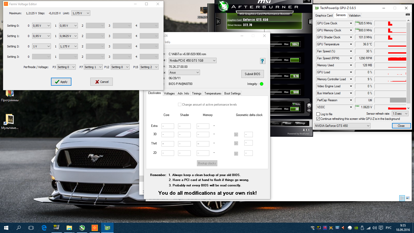 Здравствуйте форумчане. Столкнулся с проблемой поднятия вольтажа на видеокарте 450gts. Поднимаю в биосе вольтаж до 1.175 и прошиваю видеокарту после перезагрузки проверяю в программах напряжение а оно стоит 1.062. В чем проблема? В msi afterburner ползунок вольтажа возможно поднять до 1.175 но ведь это напряжение уже должно стоять по умолчанию. что я делаю не так?