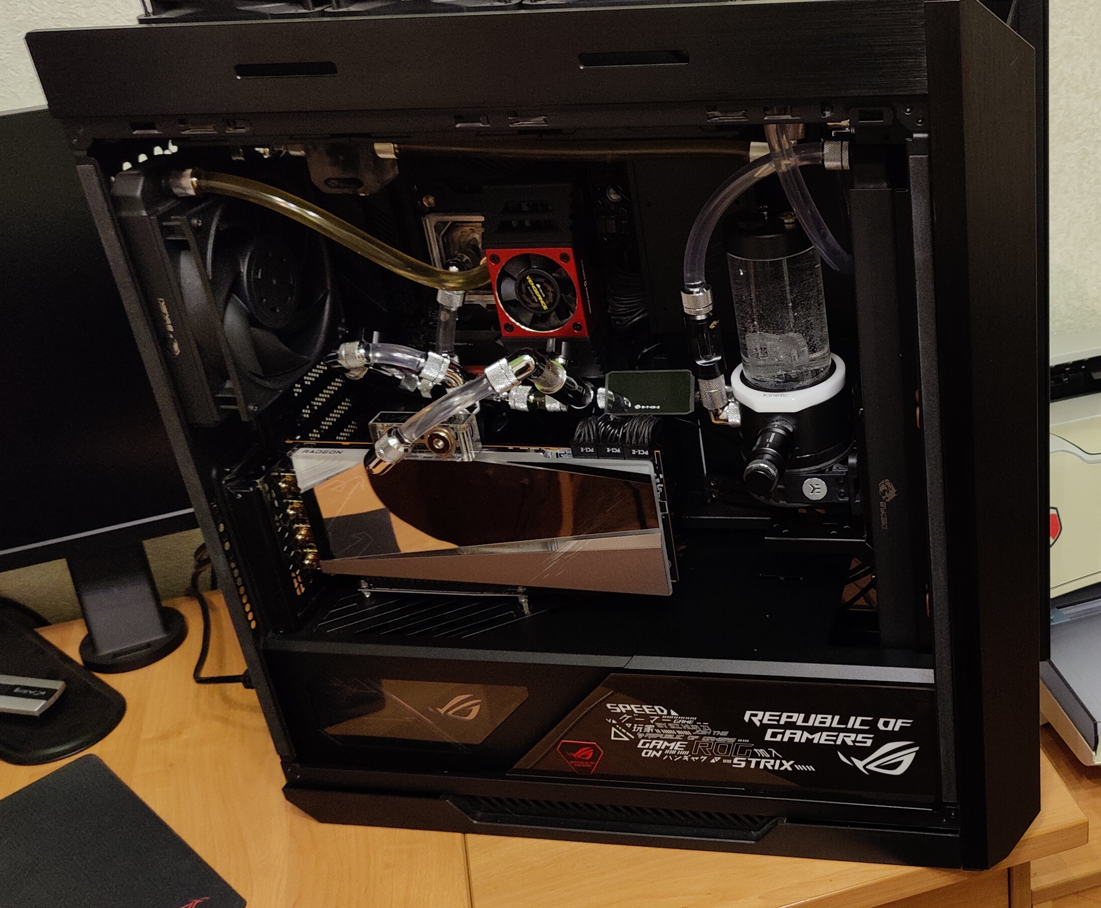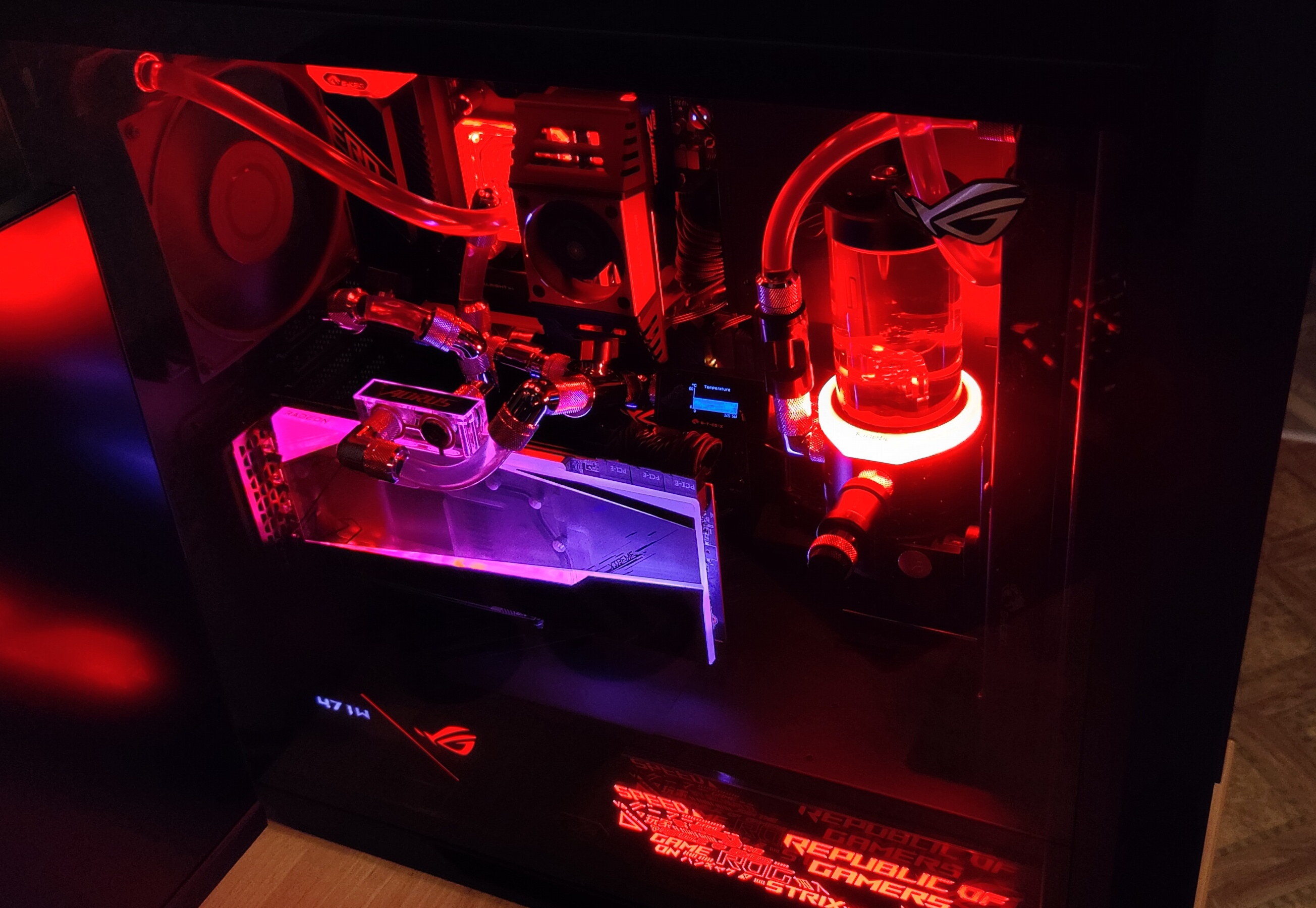 Радиаторов 3 шт: 140 (30 мм, зад), 360 (45 мм, верх), 420 (30 мм, перед). Ну синтетикой нагреть можно побольше, т.к. общую нагрузку можно сделать 800+ Вт (5950х + 6900ХТ), но в реальных задачах это конечно едва ли возможно.