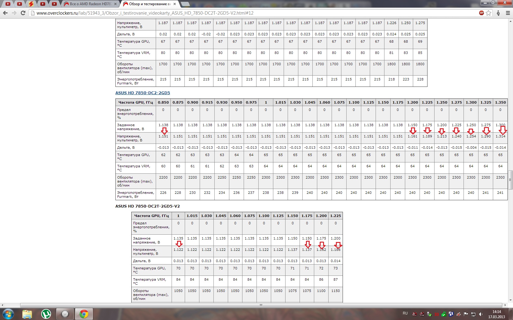 И еще заметил такую особенность - на всех(практически) HD7850 реальное напряжение(которое показывает мультиметр) как правило больше на ~0.15-0.20V чем показывают программы для оверклока, а с моим же Asus выходит обратная ситуация(напряжение меньше чем показывает софт). То бишь возможно с этим и связана выше описанная "трабла" с нужной в повышении напряжения для получения далеко не самых высоких частот?