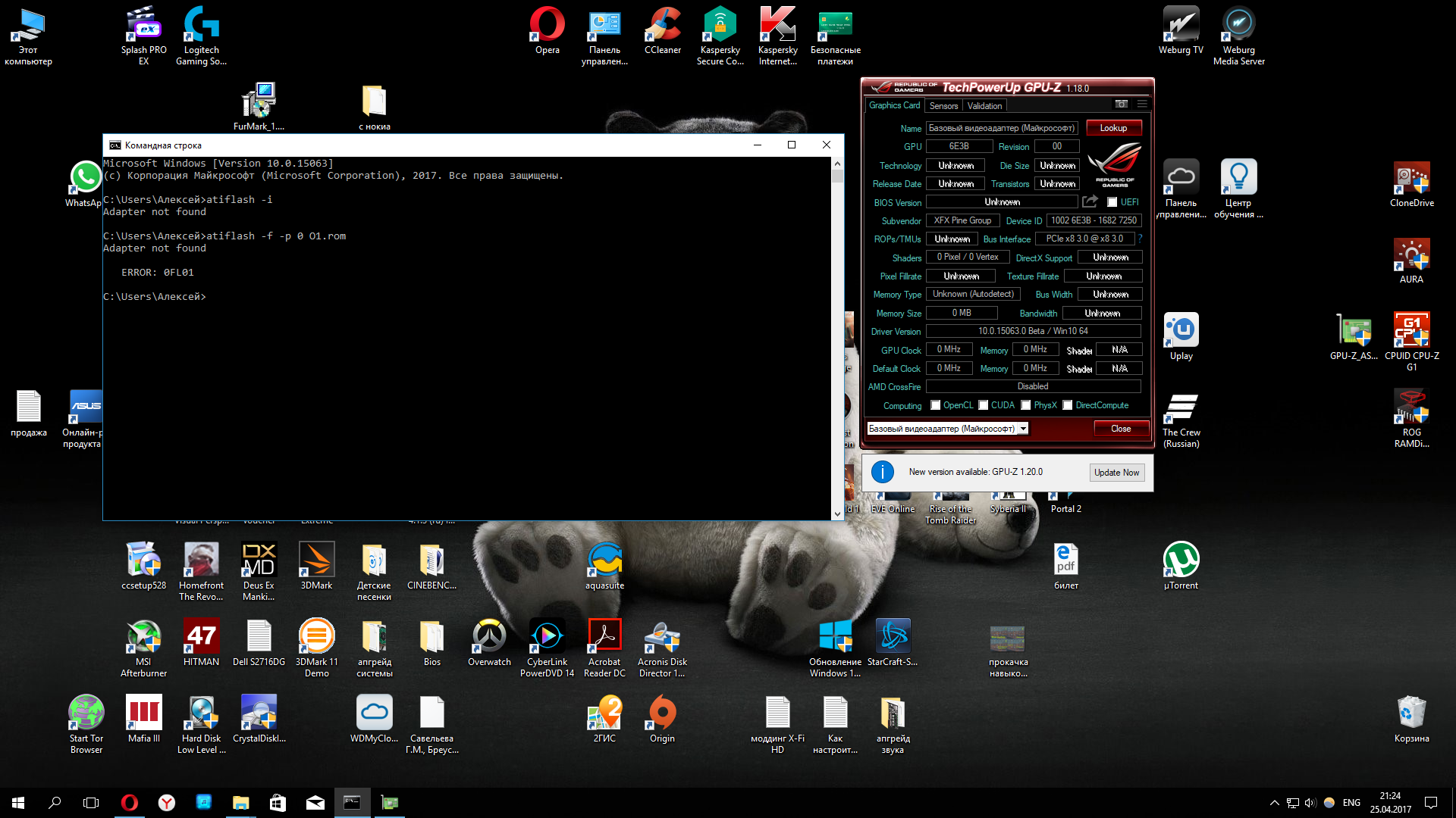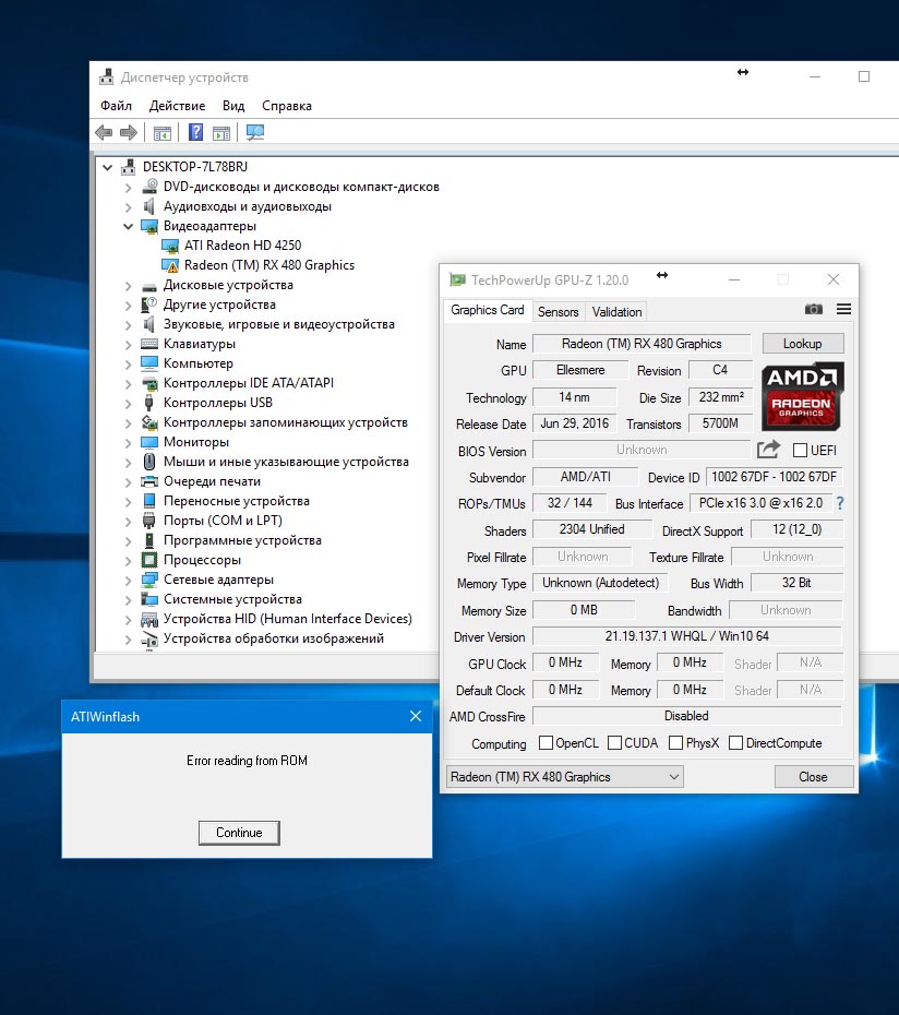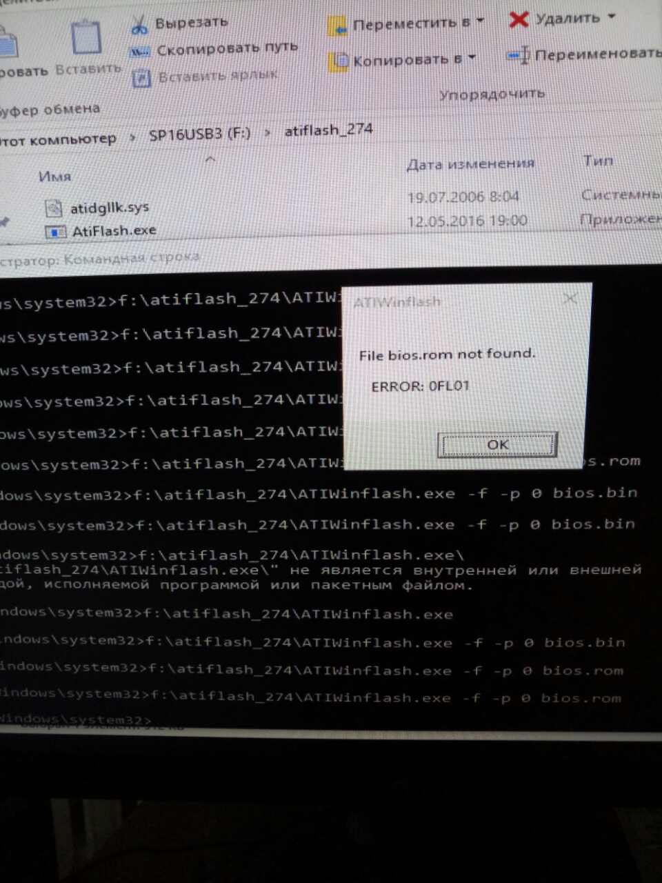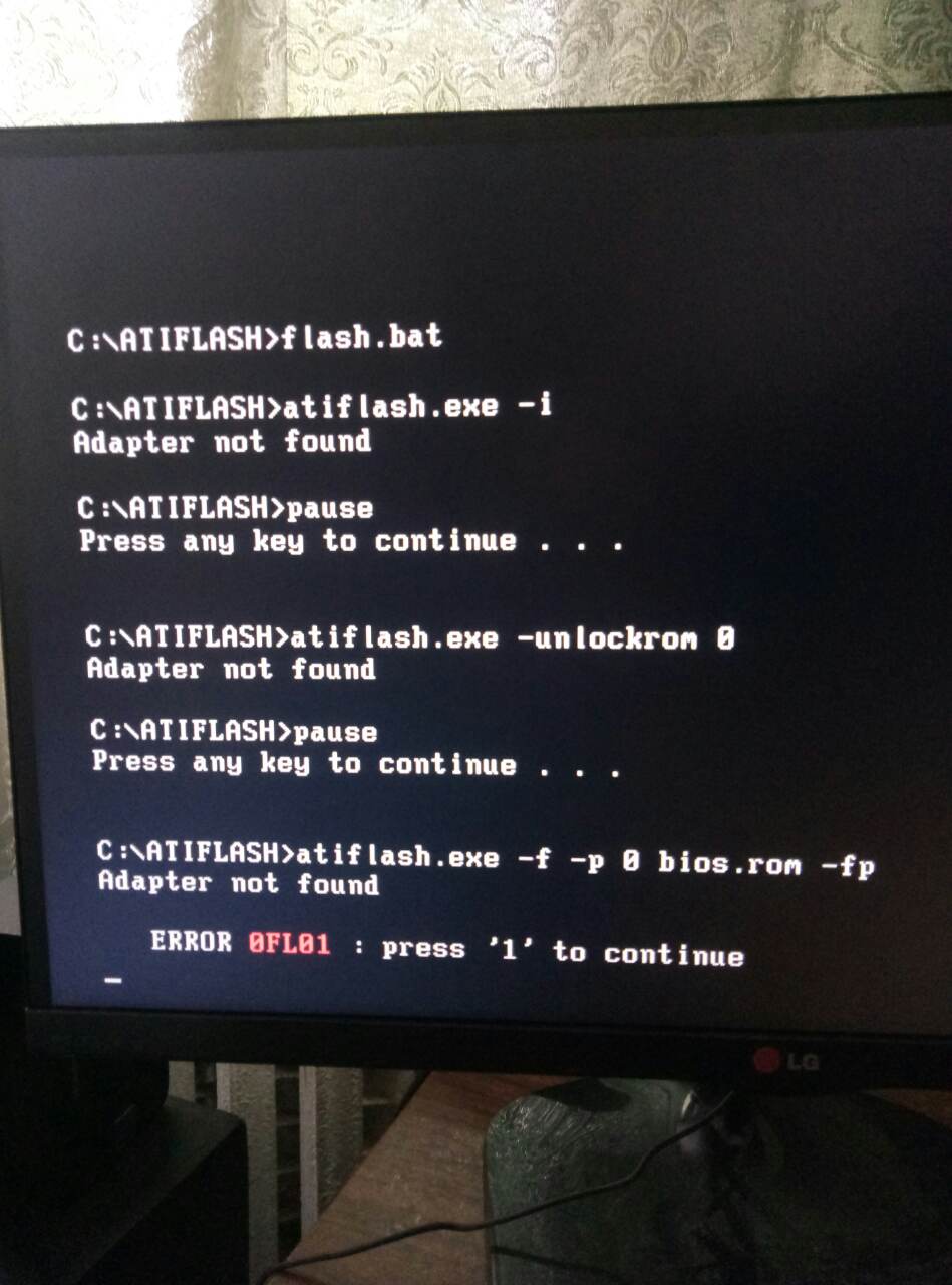 Электричество выключили когда биос почти вшился в самом конце буквально пару секунд нехватило Вот все варианты которые я пробовал: В виндовс "ATIWinflash.exe" от админа выдает "Error reading ROM" В виндовс с командной строки "ATIWinflash.exe -f -p 0 bios.rom" выдает "Bios ROM not found" В виндовс с командной строки "ATIflash.exe -f -p 0 bios.rom" выдает "не поддерживается в 64 битных системах" В ДОС "ATIflash.exe -f -p 0 bios.rom" на всех слотах выдает "адаптер не найден" может попробовать поставить вин 10 32бит?